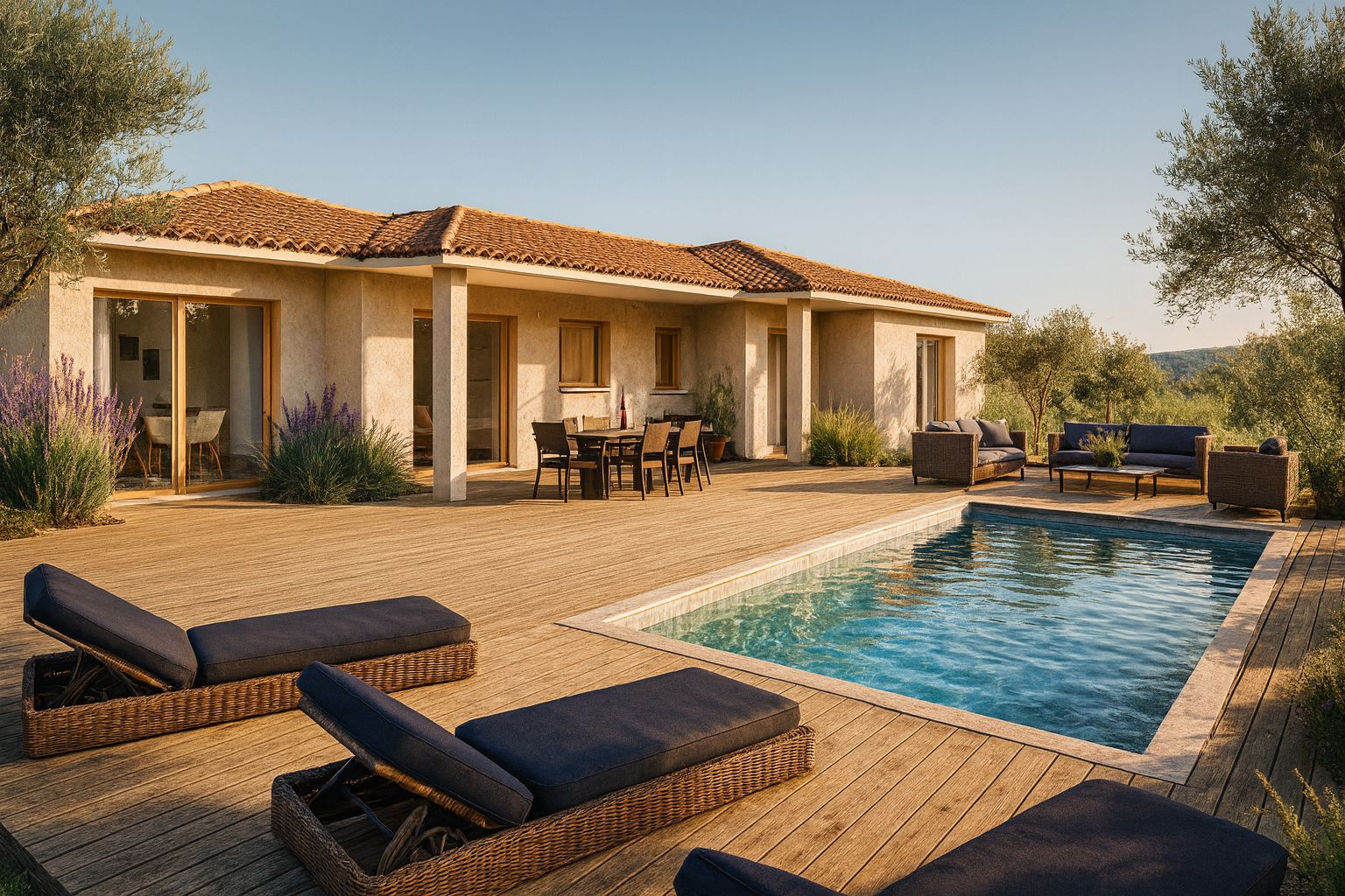 Cette villa se compose d'un séjour avec cuisine ouverte, d'une buanderie, de trois chambres dont une suite parentale avec salle de bains, douche, WC et dressing, de deux salles d'eau, et d'un WC indépendant, Une spacieuse terrasse de 25 m2 et une piscine.