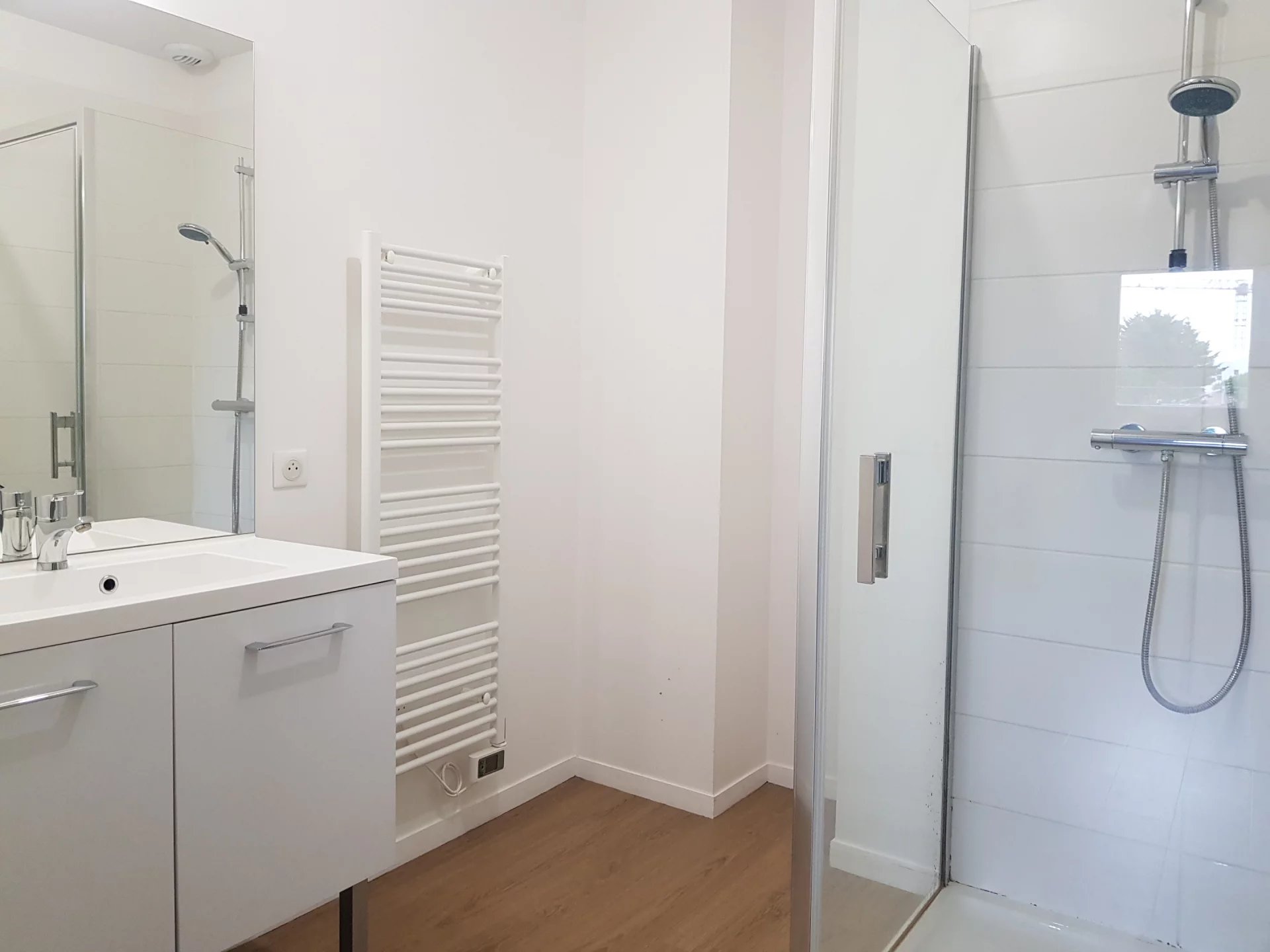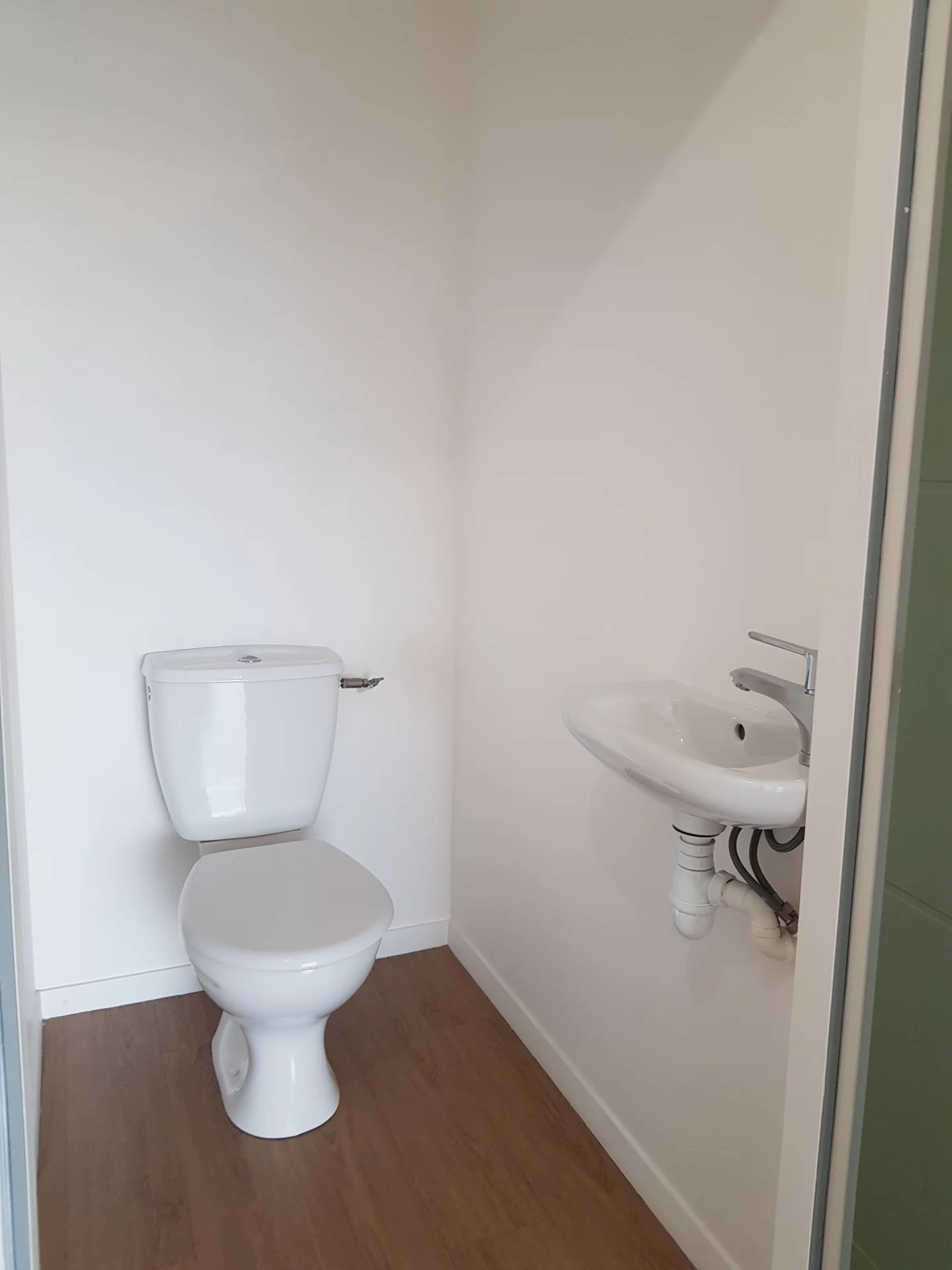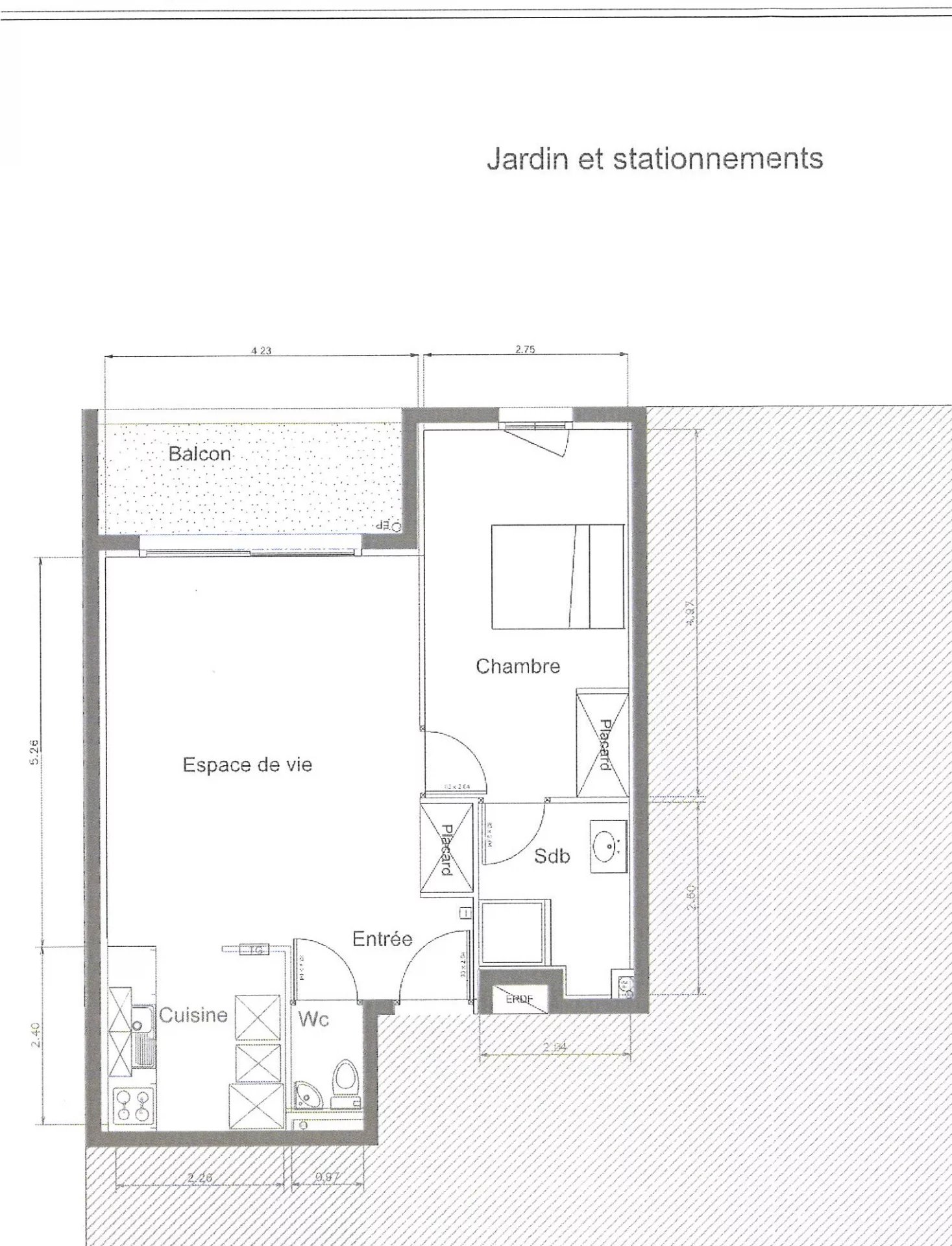 Séjour lumineux avec coin cuisine aménagée et placard donnant sur balcon, chambre avec placard, salle d'eau, wc séparé avec lave mains.