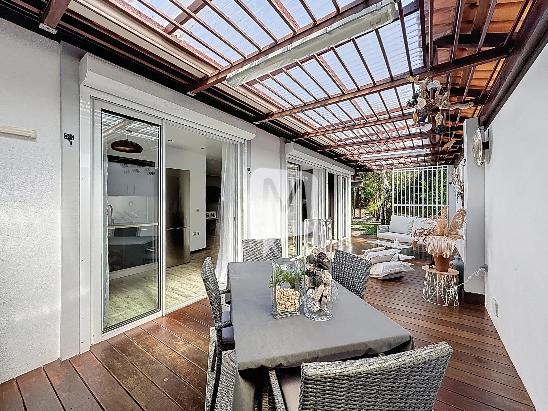 À l’extérieur, la maison propose de très beaux aménagements pensés pour profiter pleinement du climat. Vous bénéficierez d’un abri voiture, d’une cuisine extérieure aménagée, de deux terrasses conviviales et d’un abri jardin très pratique. Un WC extérieur est également disponible. Le carbet, doté d’un jacuzzi, constitue un véritable espace détente idéal pour les moments de relaxation. Vous profiterez également d’un jardin privatif, avec une jouissance exclusive d’environ 345...