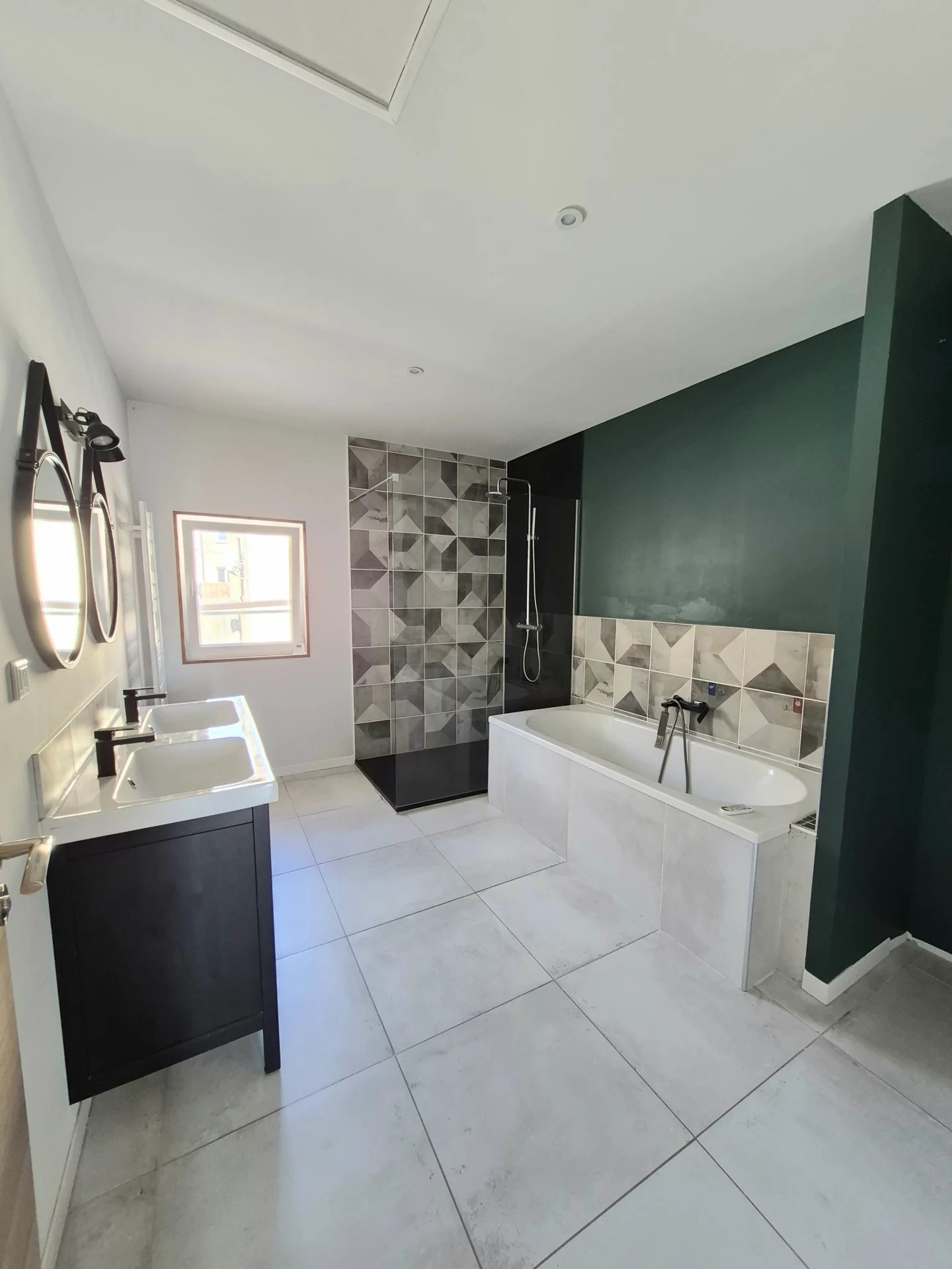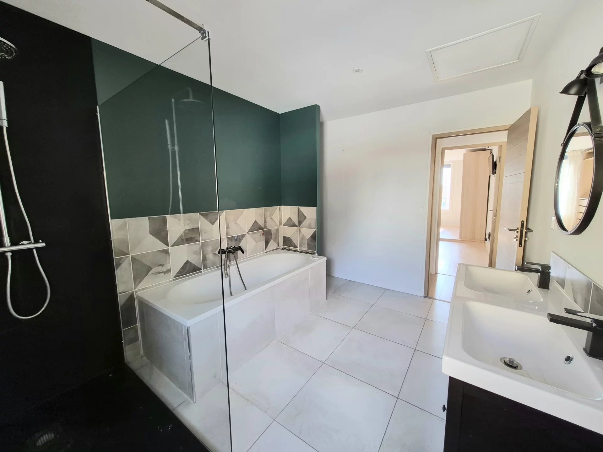 L'étage est distribué en trois chambres dont une avec dressing aménagé, une salle de bains ajourée avec baignoire et douche et un toilette indépendant.