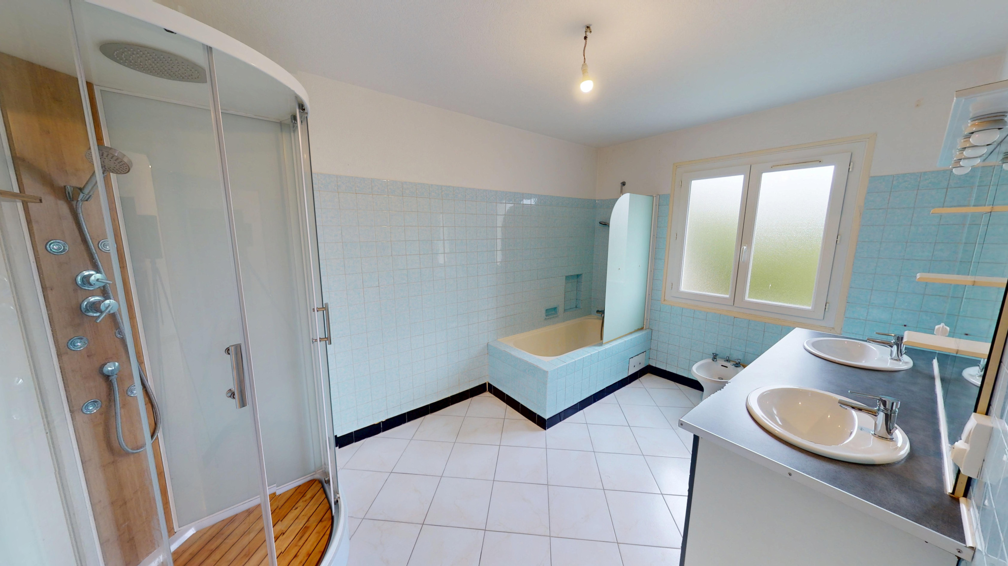 Au 1er étage : cuisine indépendante aménagée et équipée, salon/salle à manger avec une porte-fenêtre qui donne sur un petit balcon, une chambre, une grande salle de bains avec douche, baignoire et double vasque, un wc indépendant.