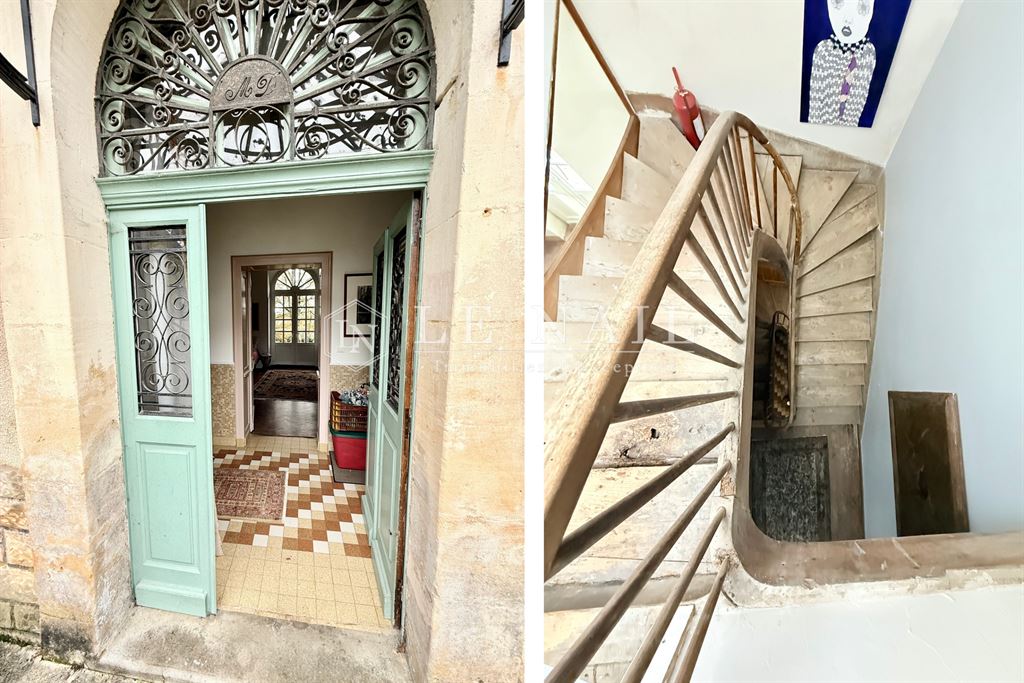 Depuis la cour, on accède à une entrée suivie d’un dégagement de distribution. On profite, sur l’ensemble du niveau, de belles hauteurs sous plafond et de menuiseries anciennes en arc, qui apportent un charme indéniable.