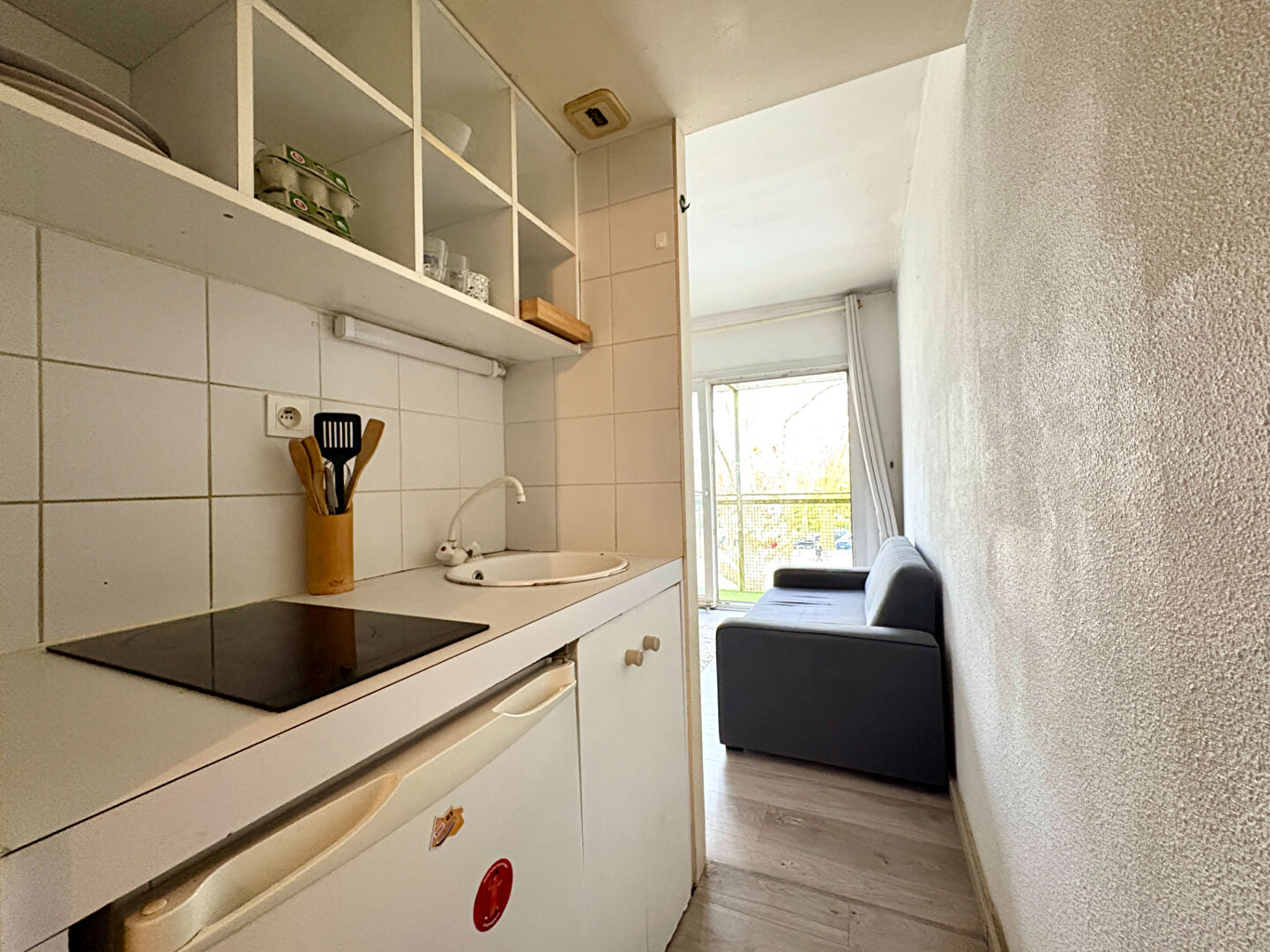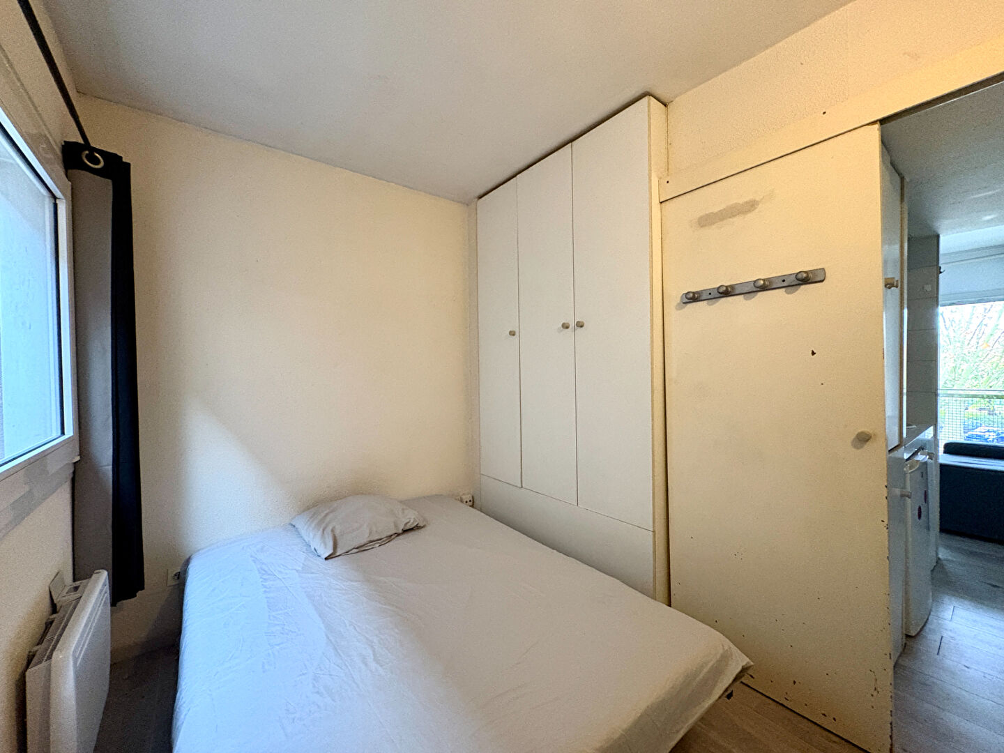 Une pièce de vie lumineuse ouvrant sur un balcon avec vue dégagée, un espace nuit isolé avec placard, une kitchenette fonctionnelle et une salle de bains avec WC.