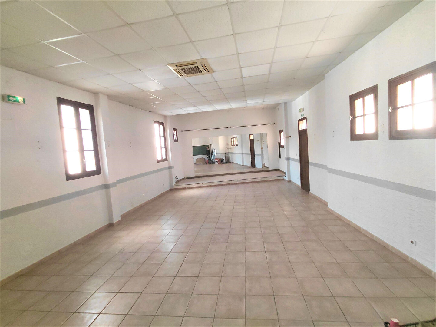 Au rez-de-chaussée : grand volume type gymnase + bureau + WC.