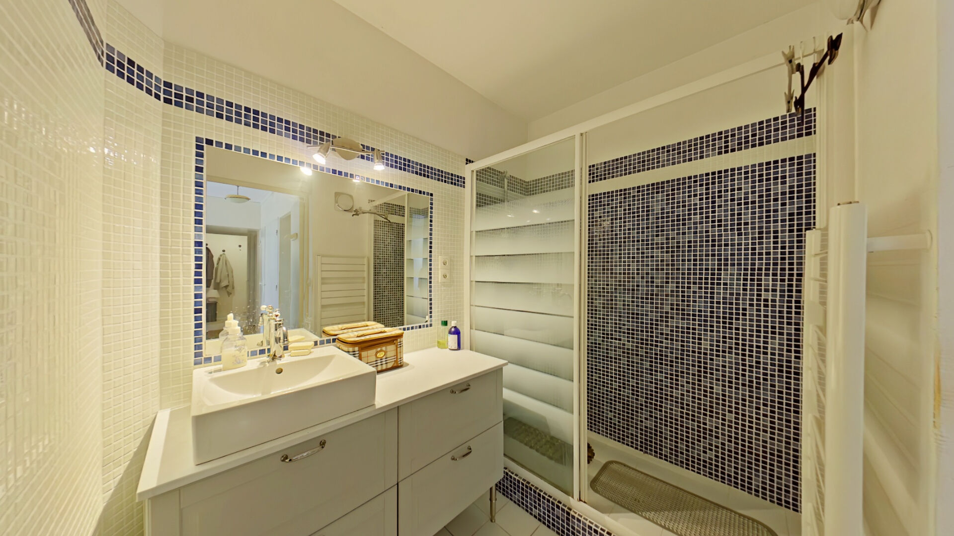 Sud, une salle d'eau récemment rénovée avec coin buanderie, un bureau et 2 chambres. L'ensemble est complété par une