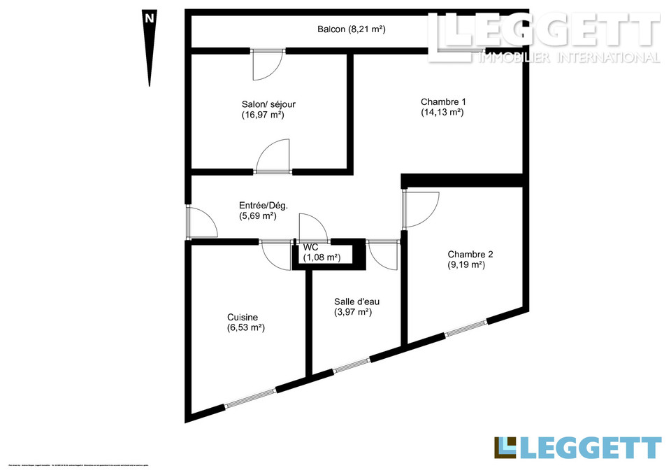 Agencement : entrée, salon/séjour (16,97 m²), cuisine (6,53 m²), 2 chambres (14,13 m² & 9,19 m²), salle d'eau, WC séparés, balcon (8,21 m²).