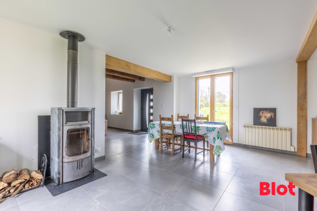 Au rez-de-chaussée : Un salon cosy, un séjour lumineux avec poêle à bois, une cuisine aménagée et équipée neuve, une suite parentale de plus de 20 m2, un WC et une buanderie.