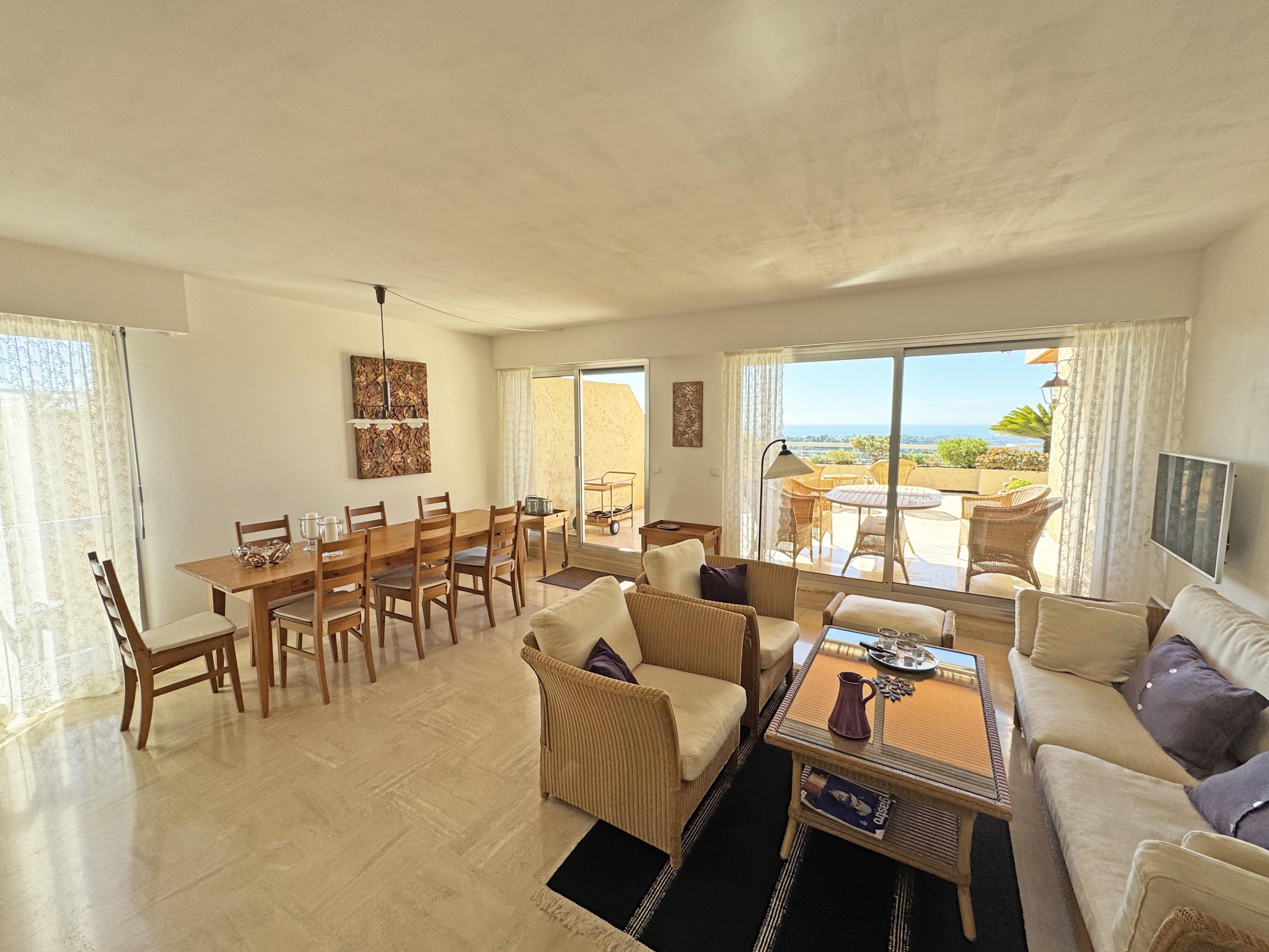 Situé dans une résidence de grand standing, sécurisée avec piscine. Vue panoramique mer et village de St Paul. Magnifique appartement de 3 pièces de 92,4 m2, terrasse de 75,55 m2. Séjour, cuisine independante équipée, chambre avec placards et salle de bains, chambre avec salle de bains. Cave et garage