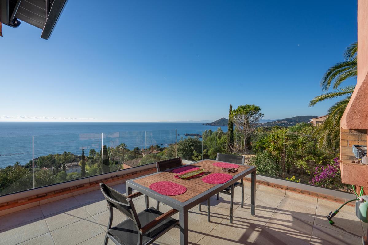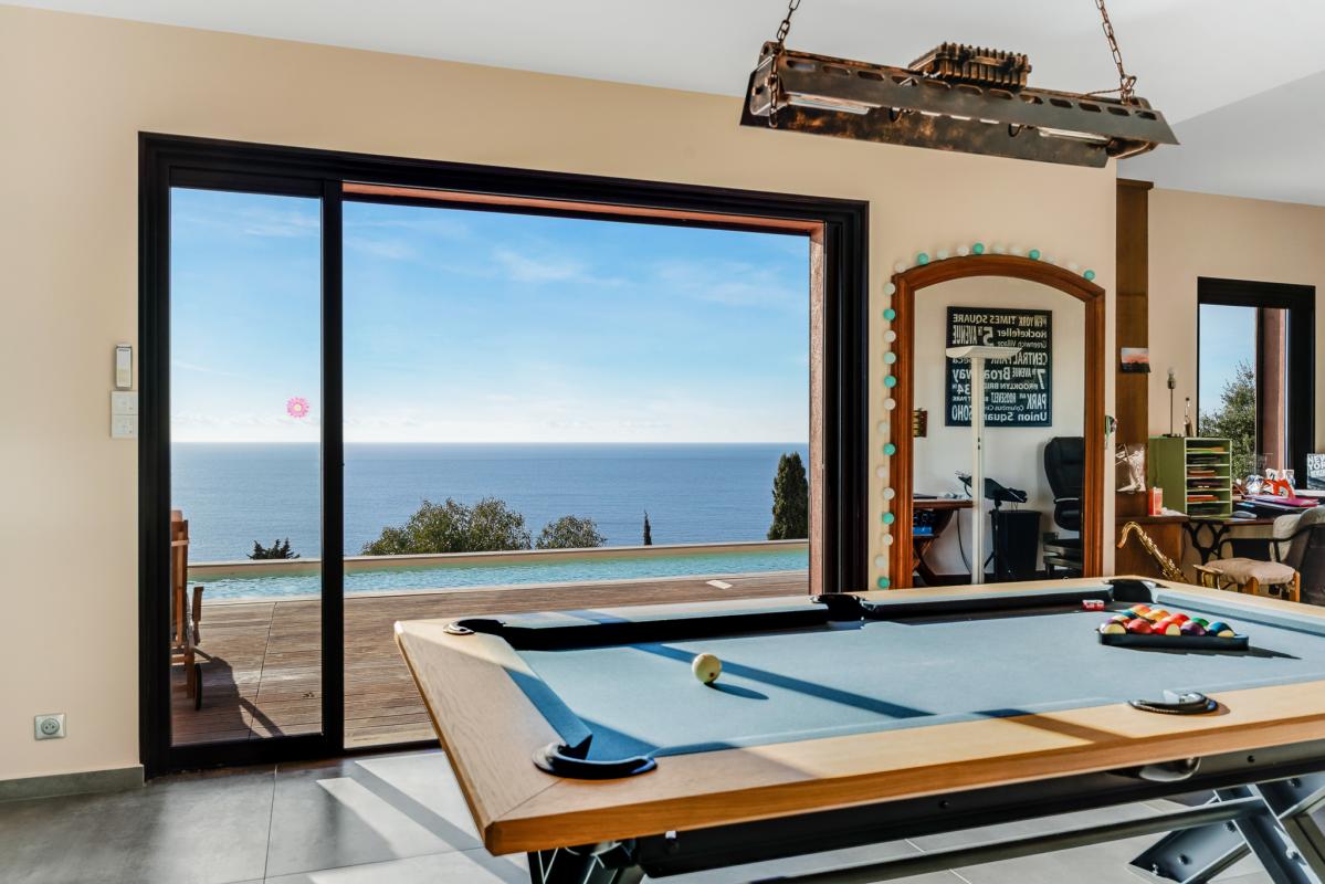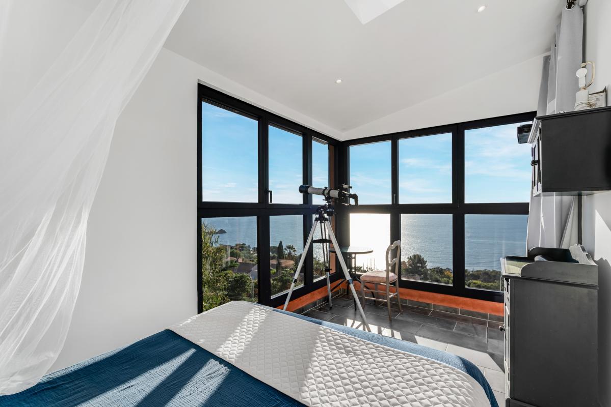 Sur les hauteurs d'Agay, cette villa d'environ 215 m² entièrement rénovée domine la Méditerranée, offrant une vue continue du lever au coucher du soleil. Les espaces de vie sont généreux et baignés de lumière, s'ouvrant sur une terrasse en surplomb et une piscine à contre-courant parallèle à l'horizon.