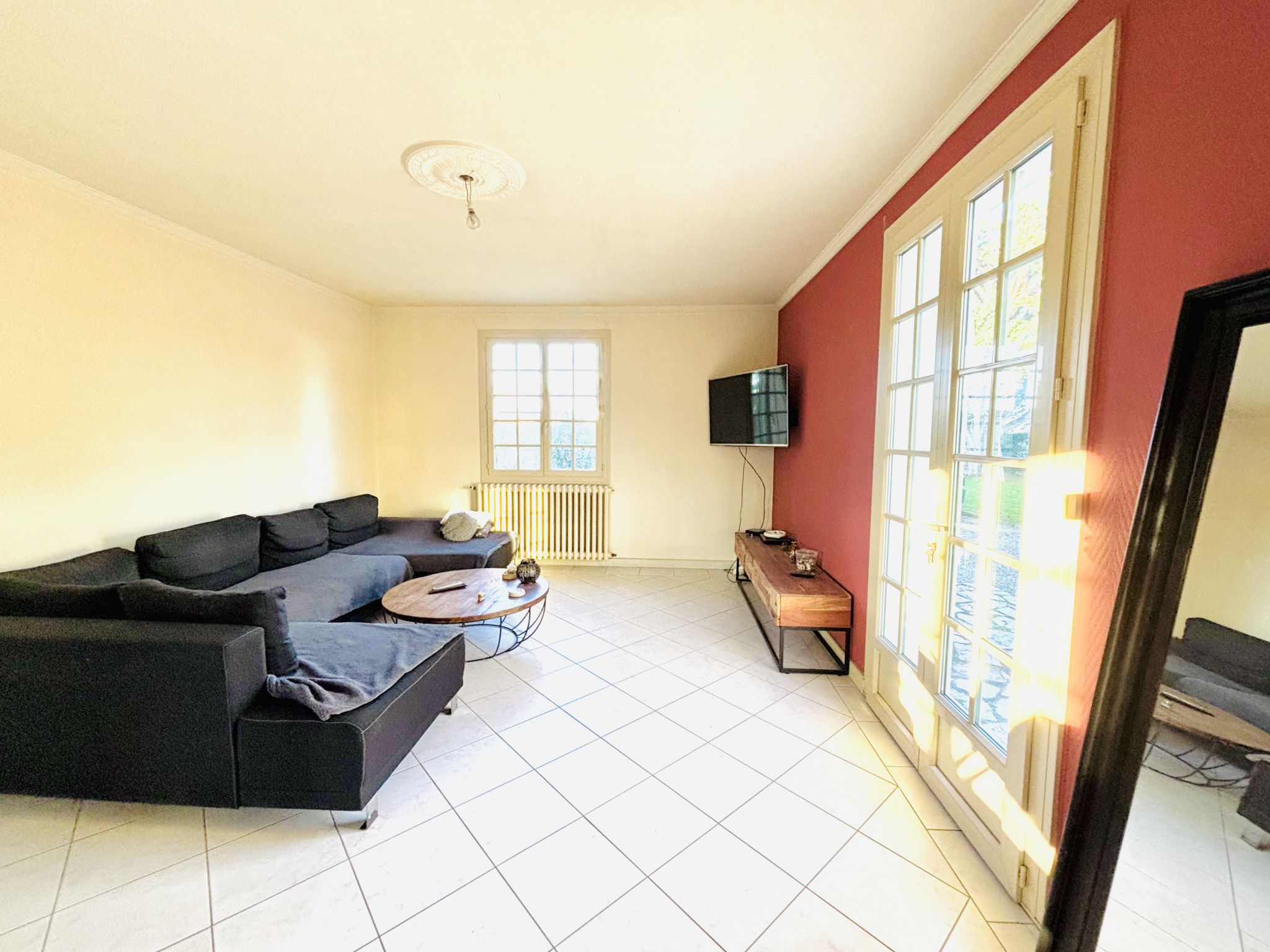 Un vaste salon / séjour de 54 m2, chaleureux et lumineux, équipé d'un insert, parfait pour les soirées d'hiver