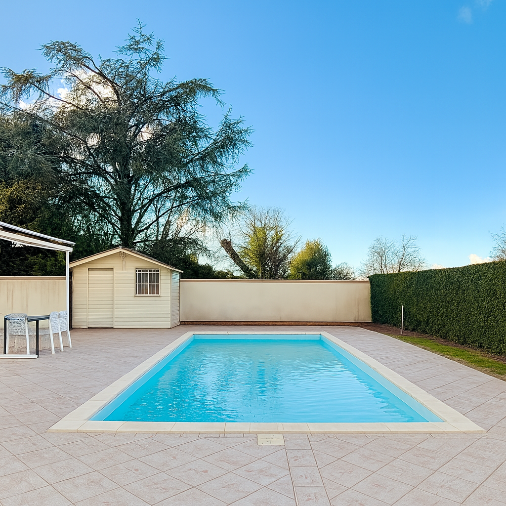À l'extérieur, vous profiterez d'un grand jardin et d'une piscine 9 x 4 m, idéale pour les beaux jours et les moments de convivialité en famille ou entre amis.