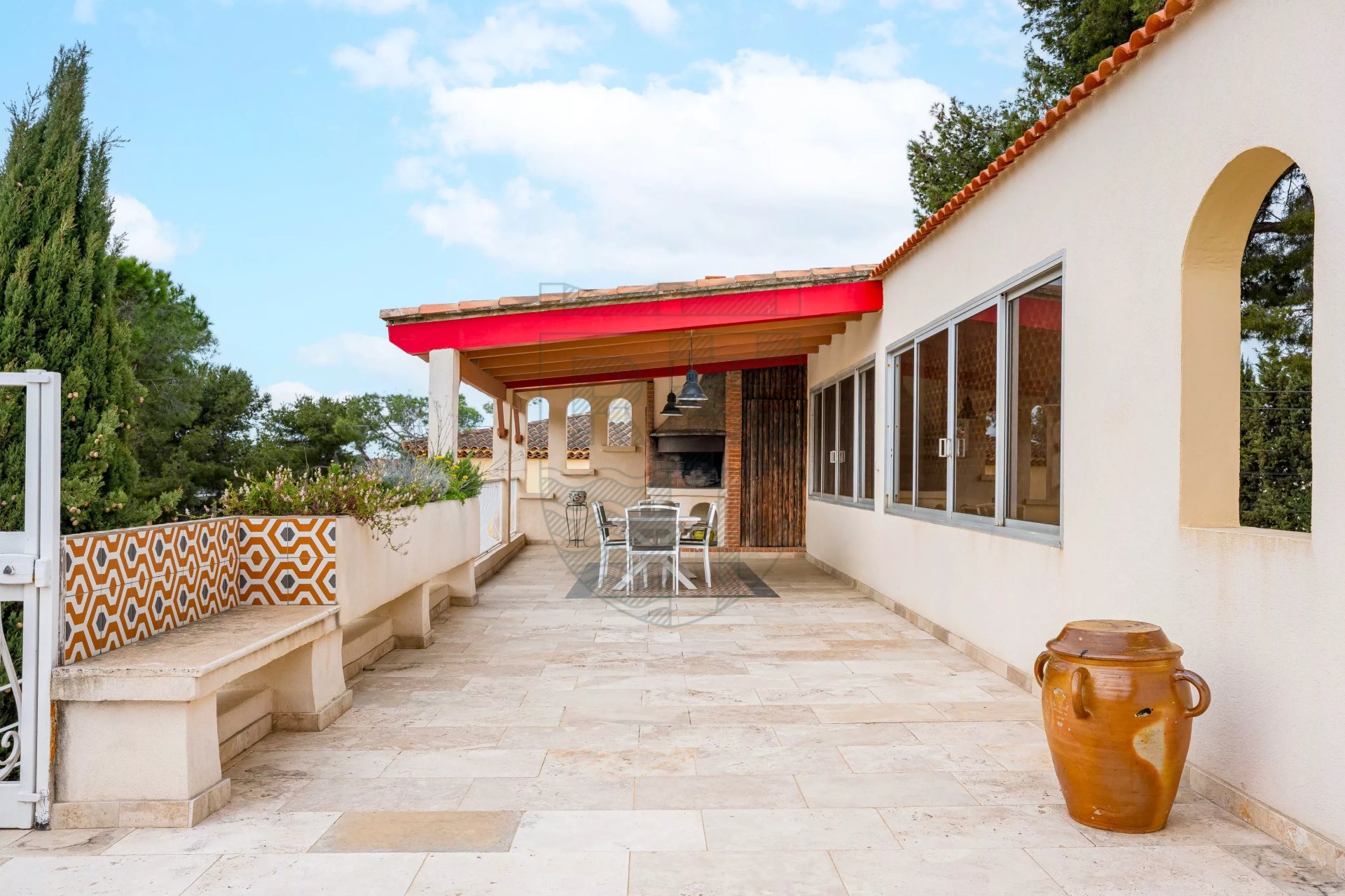 Une terrasse de 100m² court le long de la façade et se prolonge pour aboutir à une cuisine d'été avec barbecue, sur le toit de laquelle sont installés des panneau photovoltaïques.