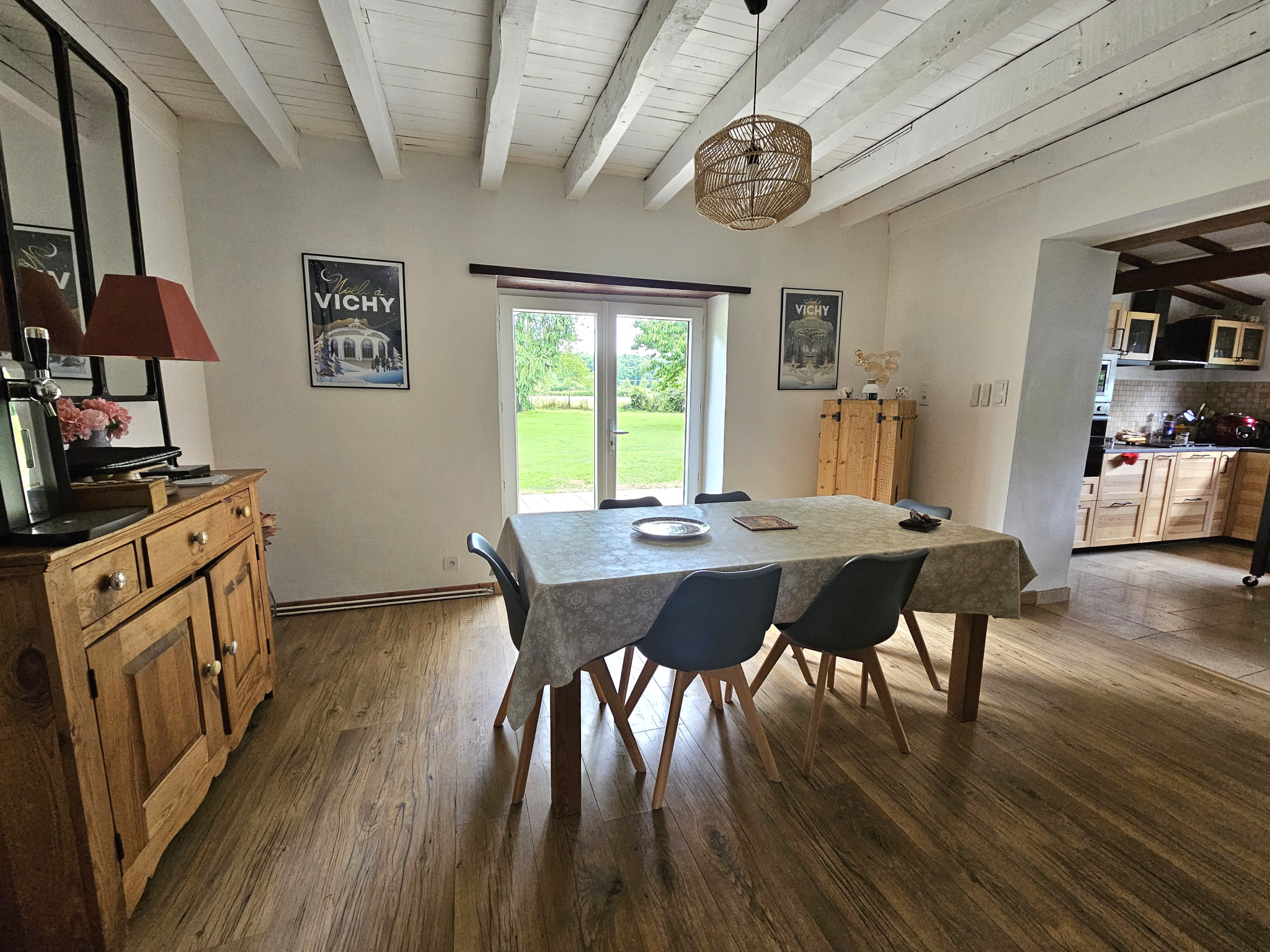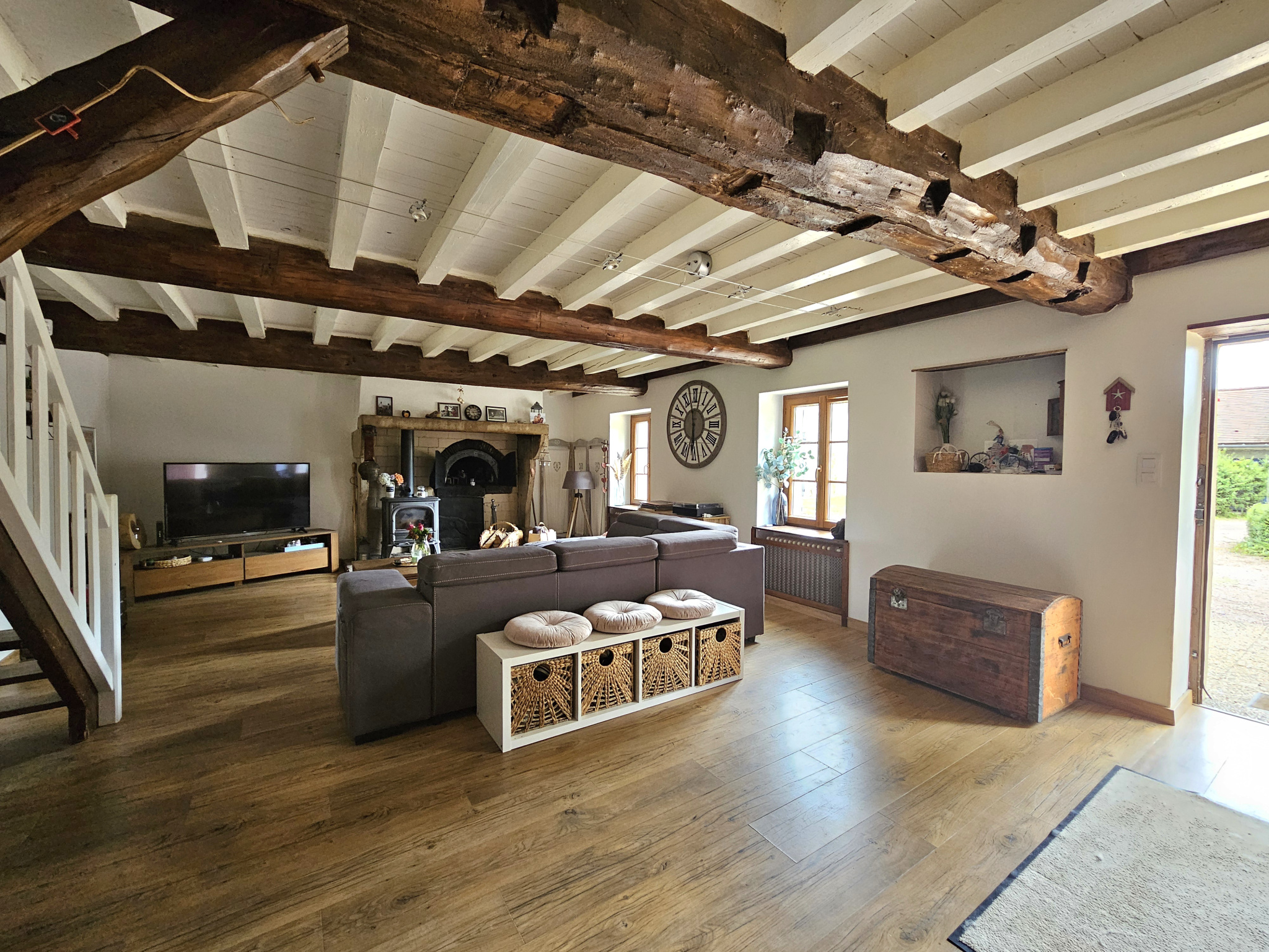 Cette maison d'habitation de caractère aux poutres apparentes offre environ 190 m2 habitables et comprend au rez-de-chaussée : entrée dans un vaste séjour de 54 m2 avec un poêle à bois et un ancien four à pain, salle à manger, cuisine équipée attenante, chaufferie-buanderie, véranda ; chambre avec placard-dressing, bureau, salle de bains, WC.