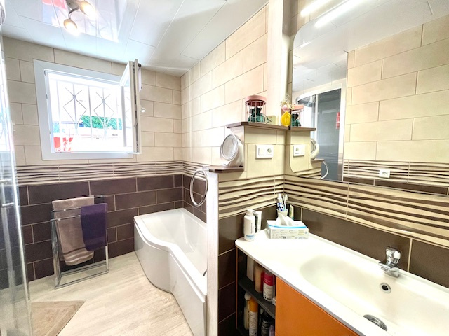 La maison a été entièrement rénovée avec goût, elle est composée de 3 chambres, dont une avec dressing, une salle de bain avec douche et baignoire, et une cuisine équipée donnant sur une belle terrasse orientée ouest, un salon/séjour, une buanderie avec accès direct au garage.