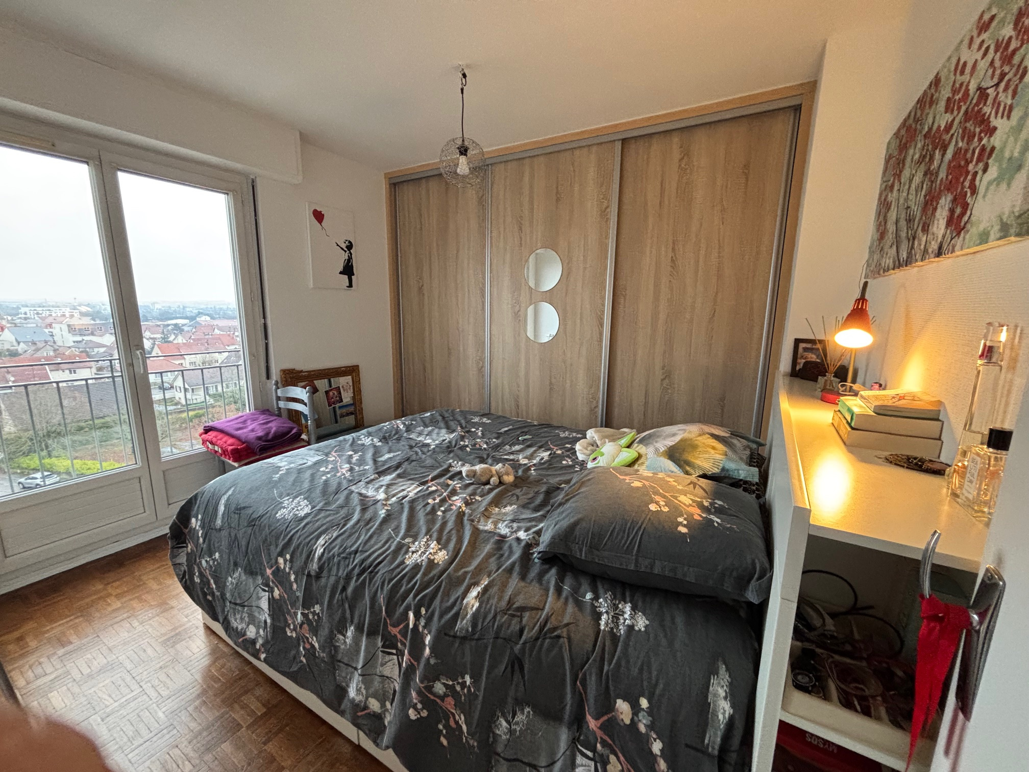 A VENDRE CHENOVE (5mn DIJON Sud - Tram - Divia - quartier très calme) au 6eme étage avec asc, lumineux appartement de type 2 de 43,26 m2 (belle vue), entrée parquet, séjour parquet (balconnet avec vue plongeante), cuisine meublée indépendante, chambre (parquet) salle de douche avec wc et espace buanderie, cave, parking collectif
