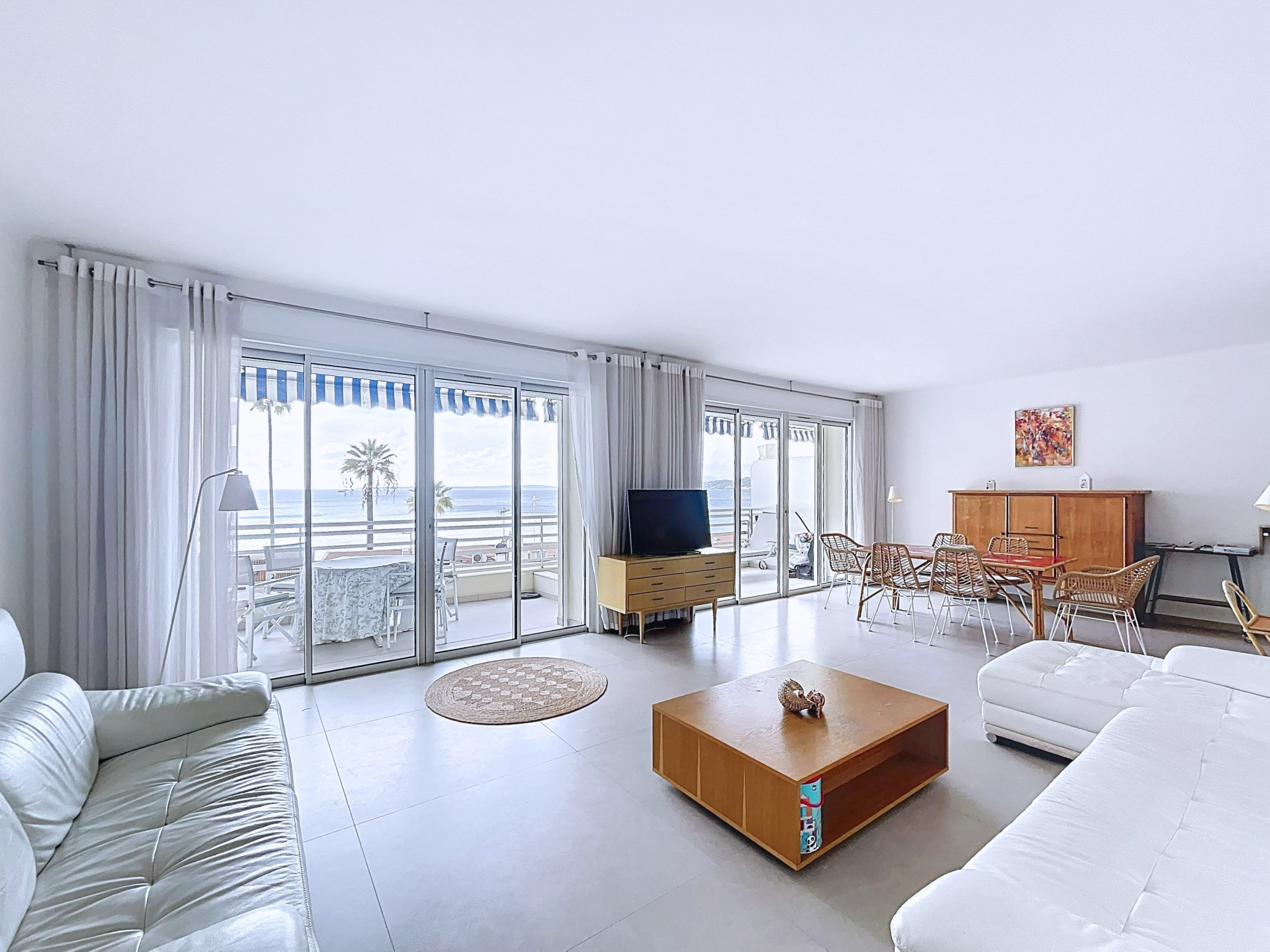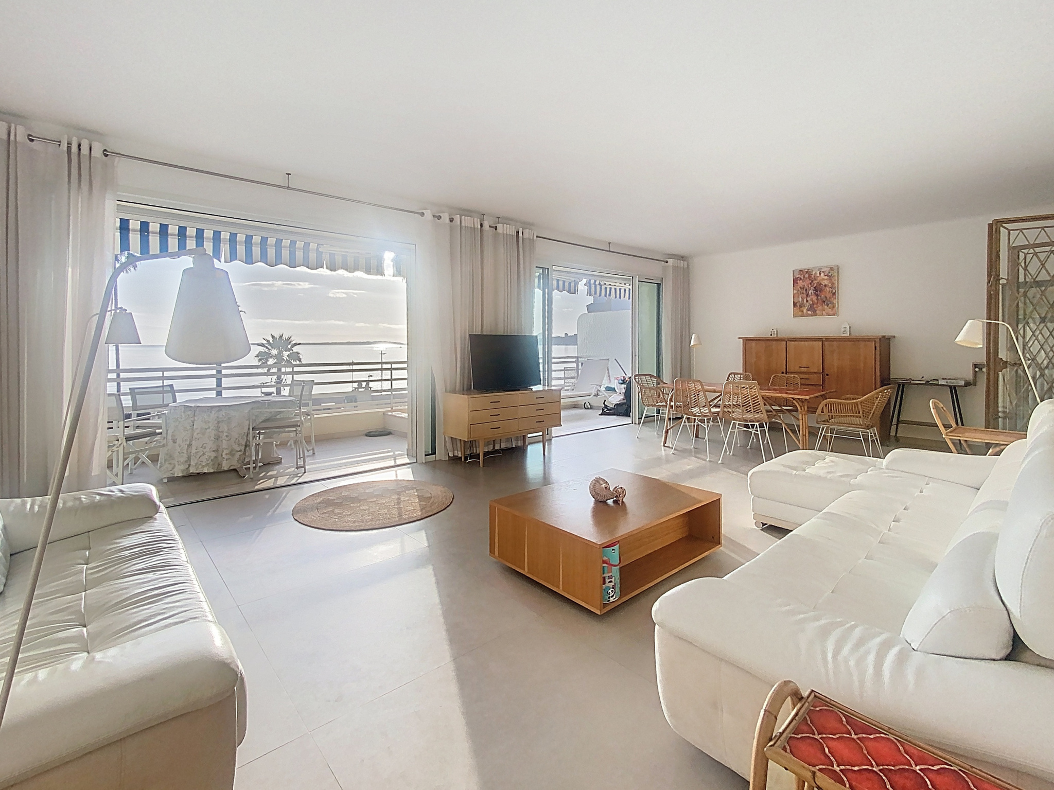 Planet Collection Agency is delighted to present this exceptional 5-room apartment offering 148.11 sqm of living space, enhanced by a magnificent 25.5 sqm terrace with panoramic sea views over the Lérins Islands and the Pointe de la Croisette. Ideally located on the seafront in Juan-les-Pins, just steps away from beaches, shops, schools and public transport, this outstanding property is set within a secure, high-end residence with caretaker.The apartment impresses with its generous volumes, abundant natural light, and perfectly designed layout. It features a spacious contemporary kitchen, fully fitted and equipped, a refined 40 sqm living room opening onto the south-facing terrace, offering an exceptional Mediterranean lifestyle. The night area comprises four elegant bedrooms, including two en-suite suites with private shower rooms and toilets, ensuring privacy and absolute comfort. High-quality features include reversible air conditioning, a large custom-made walk-in dressing room, ample built-in storage, a guest toilet, and a third shower room with toilet. A secure private parking space with numbered owner badge completes this rare and exclusive property. Subject to co-ownership regimes. Annual Fees : 4800 EUR - Salers fees included.
