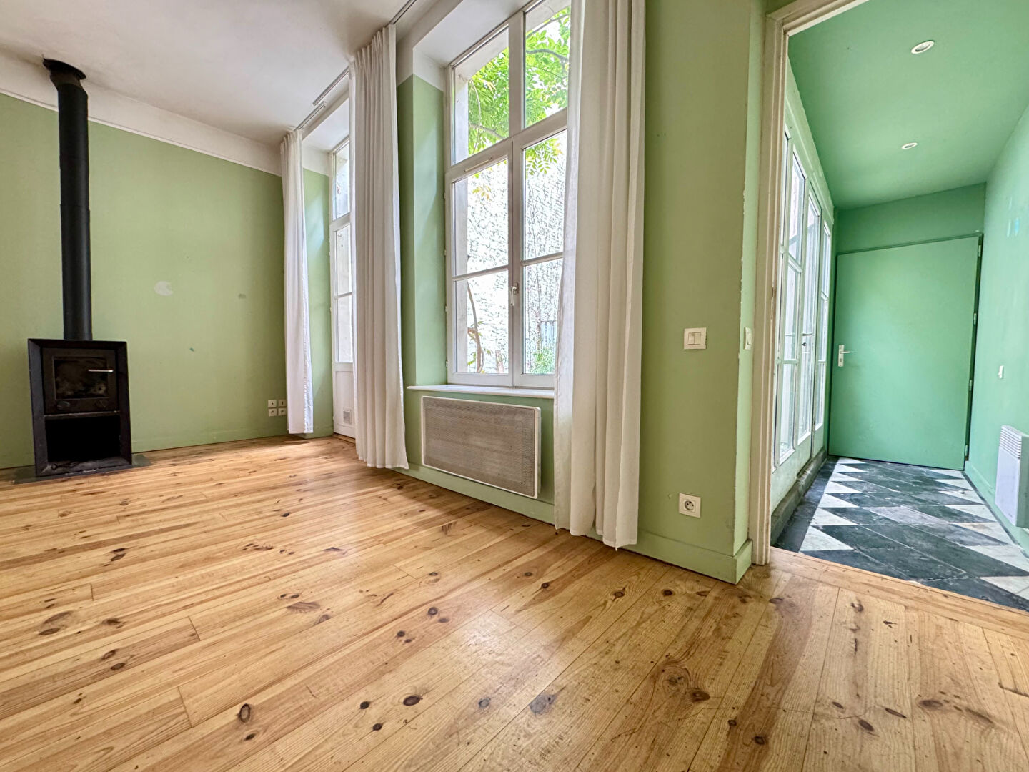 La pièce de vie d'un peu plus de 30 m² séduit par sa belle hauteur sous plafond, ses parquets d'origine, sa lumière traversante et ses deux grandes portes-fenêtres ouvrant sur une terrasse de 17 m².