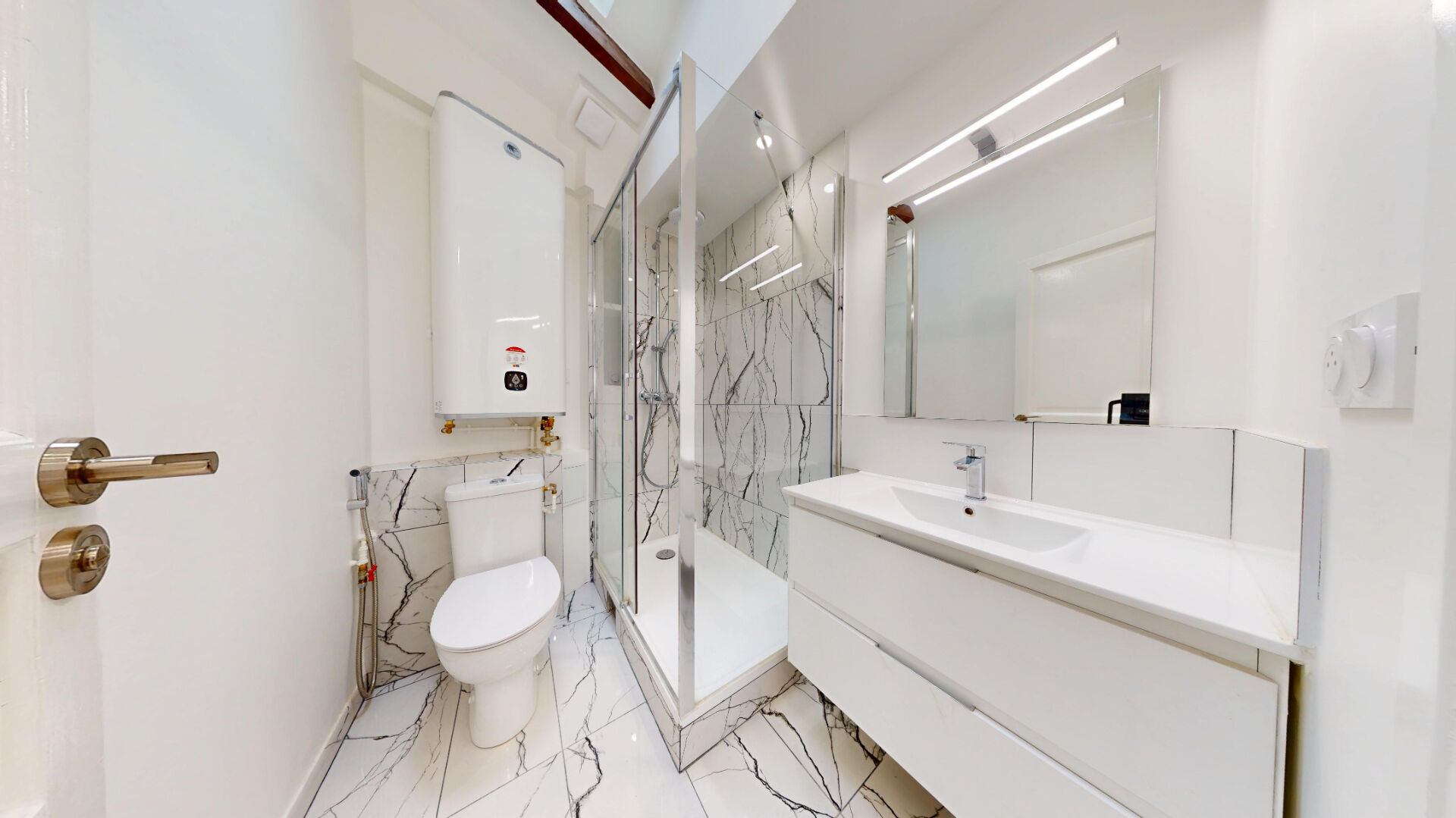 Salle d'eau moderne : douche, meuble vasque, WC avec évacuation 100 mm, ballon thermodynamique plat, sol carrelé et surtout un Velux, apportant lumière naturelle et aération, un atout rare dans ce type de bien.