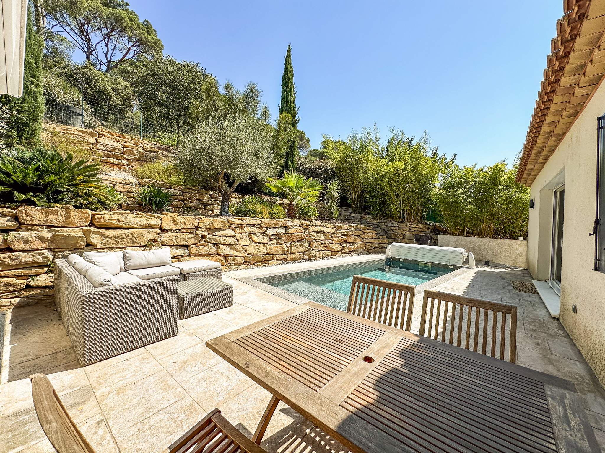 La pièce de vie s'ouvre sur une terrasse avec piscine et un pool-house équipé. Les 760m2 de terrain en restanques, vous permettent d'avoir plusieurs espaces intimistes pour profiter au maximum de la magnifique vue dégagée sur la campagne de Pierrefeu.