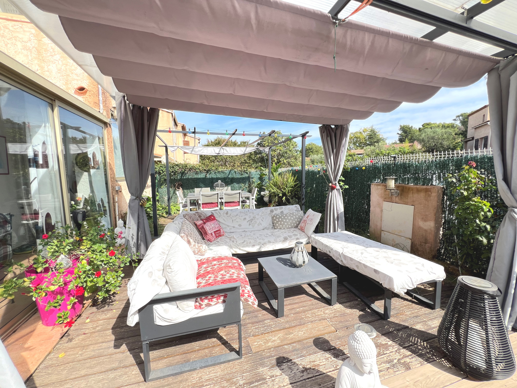 TOULON EST dans un environnement calme, au sein d'un petit lotissement sécurisé, maison 4 pièces 97m2 situé sur une parcelle de 250m2 env. Elle se compose d'un beau séjour de 34m2 avec cheminée, d'une cuisine équipée attenante, à l'étage de 3 chambres avec rangements intégrés dont une avec balcon, et d'une salle d'eau; ainsi qu'un WC à chaque niveau, de plus vous disposez d'une véranda de 17m2 (portant la surface utile à 114m2). A l'extérieur se trouve un espace jardin agrémenté de 2 terrasses, d'un cabanon, d'une aire de staionnement et d'un garage de 14m2. L'ensemble est en très bon état et parfaitement entretenue (climatisation, double vitrage, volets électriques ...).