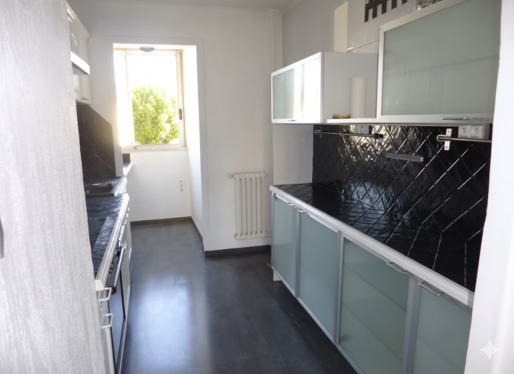 Une cuisine séparée et fonctionnelle bénéficiant d'un balcon supplémentaire, très pratique pour le rangement ou un coin petit-déjeuner.
