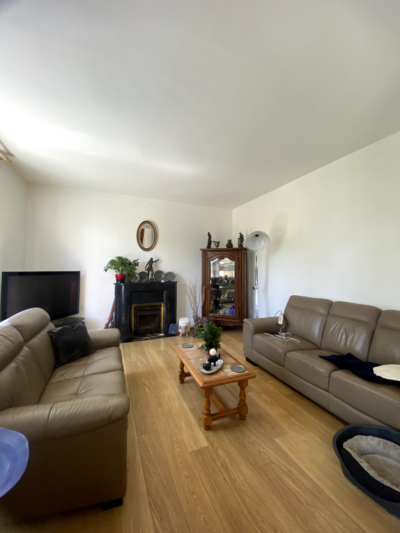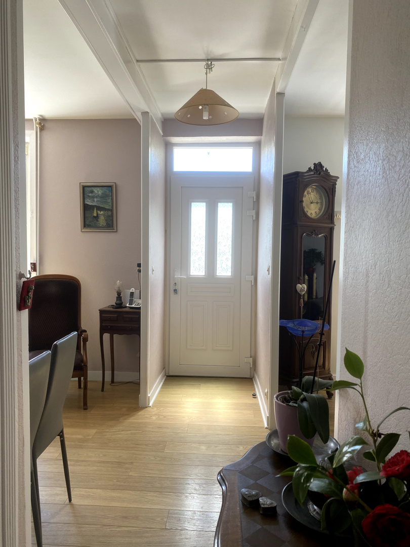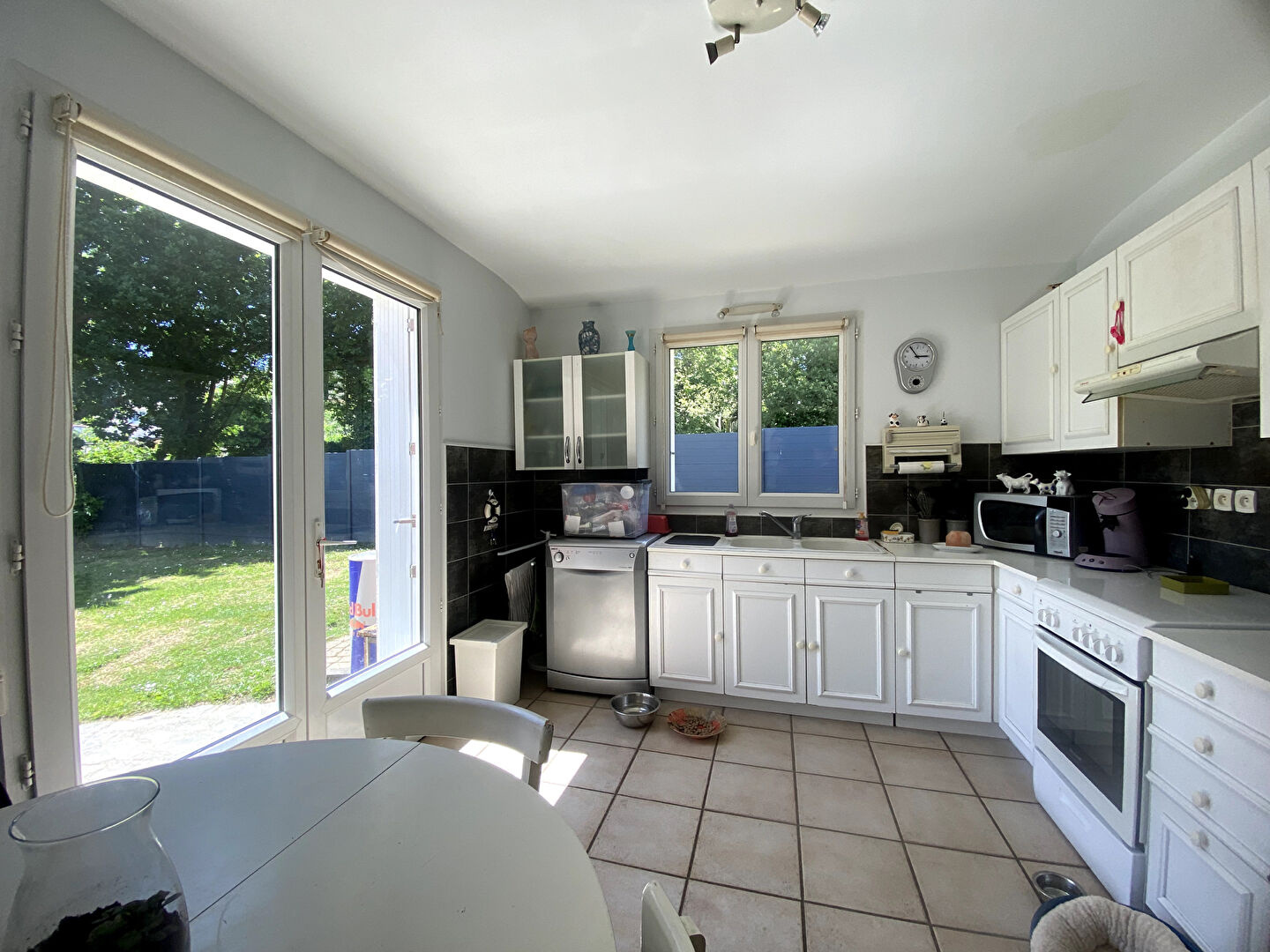 La maison se compose au rez-de-chaussée d'une entrée menant à un lumineux salon-séjour équipé d'une cheminée insert, parfait pour des soirées chaleureuses. Un couloir dessert ensuite une salle de douche, deux W.C., trois chambres, une cuisine aménagée et équipée, ainsi qu'un débarras et une chaufferie.
