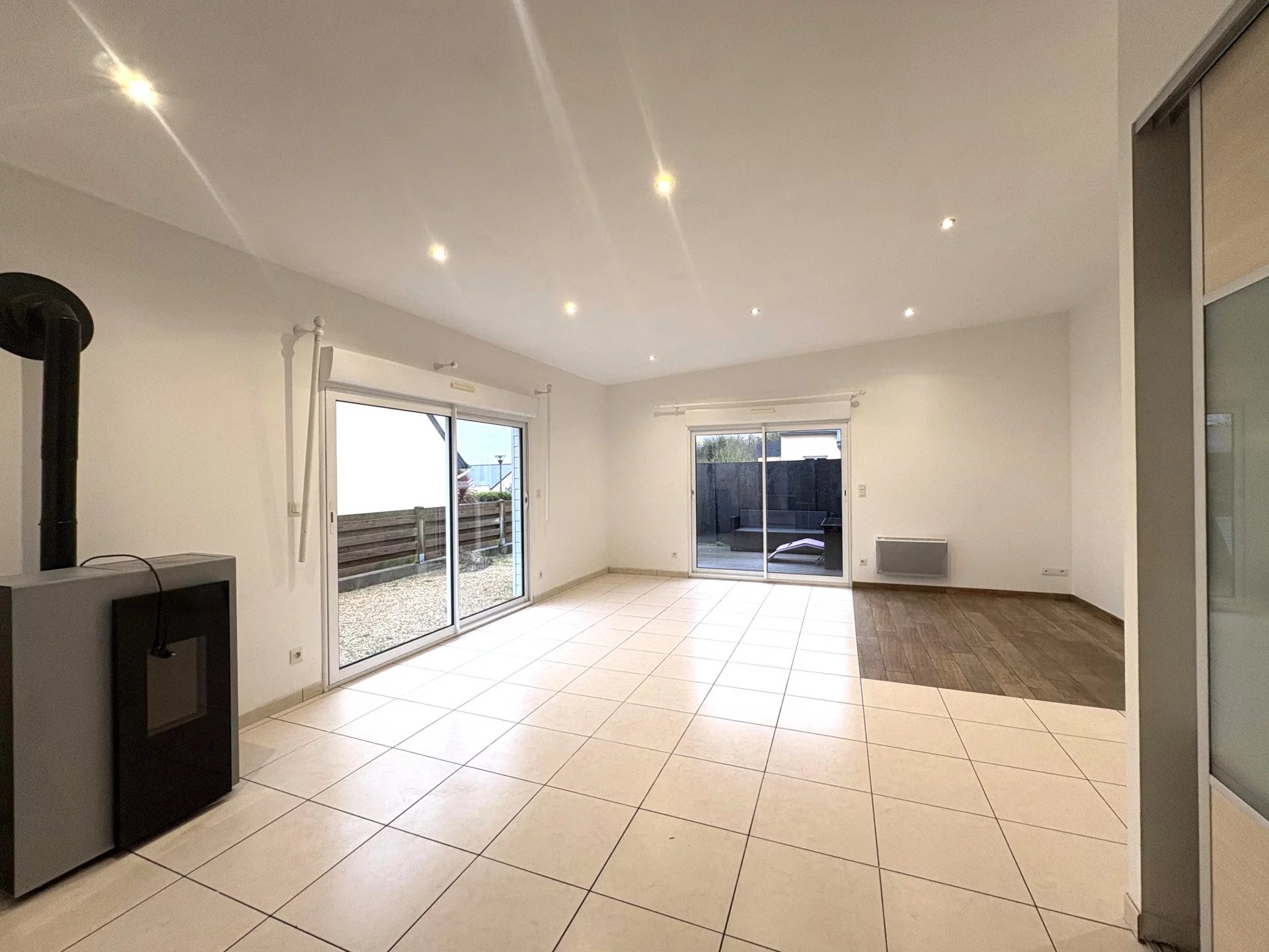 TREMUSON, proche SAINT BRIEUC, maison 6 P. de 2009, de plain-pied comprenant : entrée avec placards, beau séjour-salon accès direct sur terrasse - cuisine équipée, buanderie, 4 chambres dont 1 avec salle d'eau privative, autre salle d'eau, WC, atelier - carport - jardin