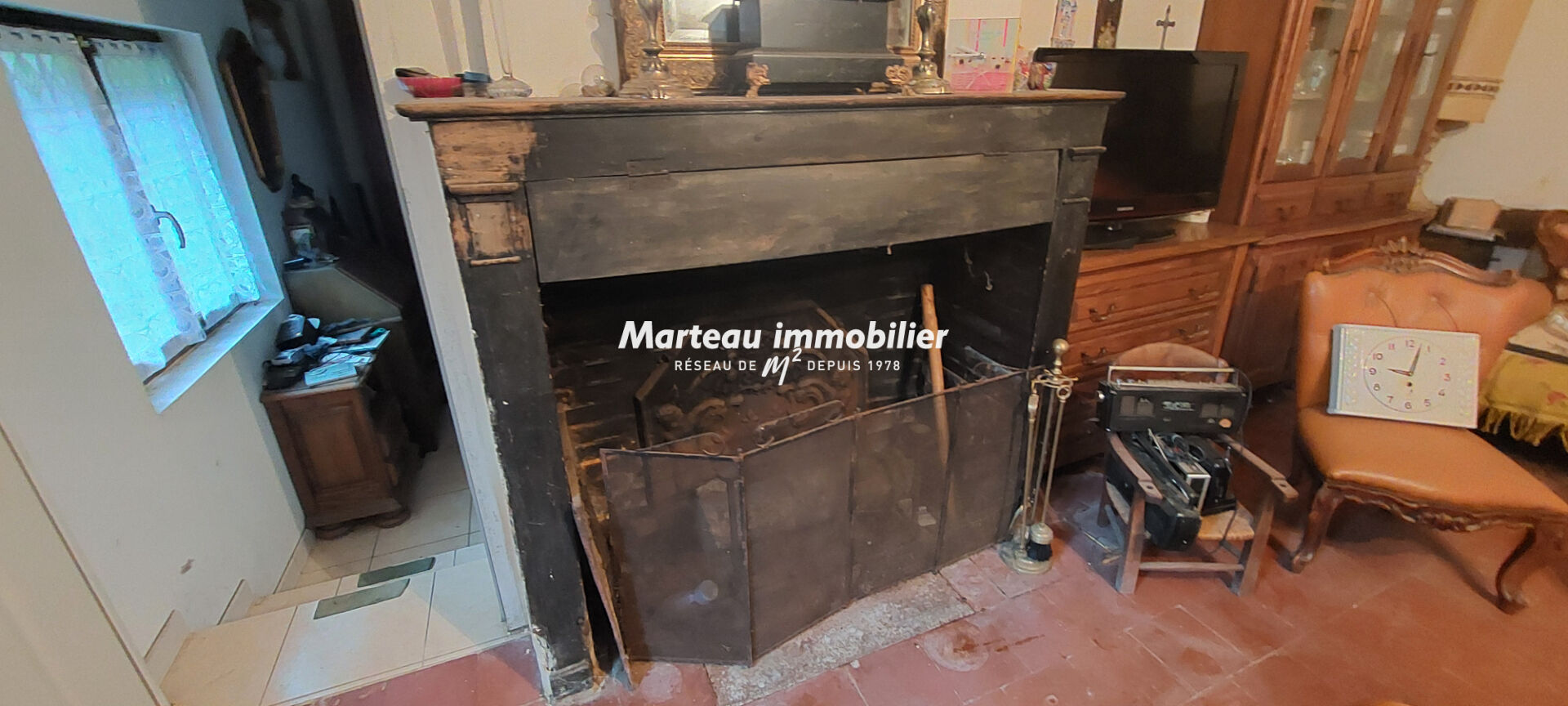 Au rez-de-chaussée, la maison propose une cuisine, une salle à manger chaleureuse avec cheminée ouverte, ainsi qu'un salon plein de caractère agrémenté d'une seconde cheminée, de tomettes anciennes et de colombages. Une chambre et une salle d'eau avec WC complètent ce niveau.