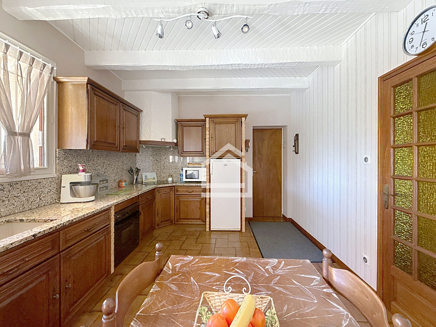 La maison se compose d'une entrée avec placards, d'une grande pièce de vie avec salon, salle à manger et cheminée, puis d'une cuisine indépendante avec accès direct vers l'extérieur.