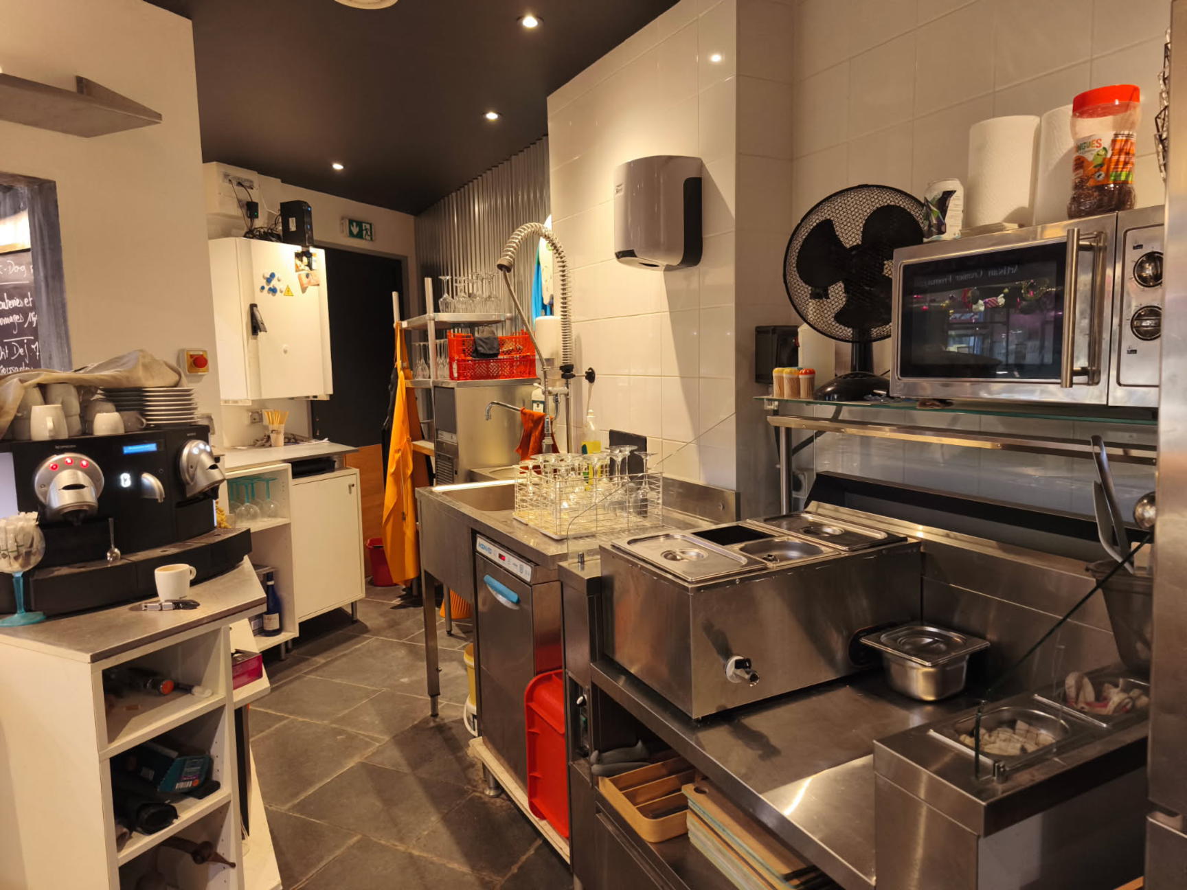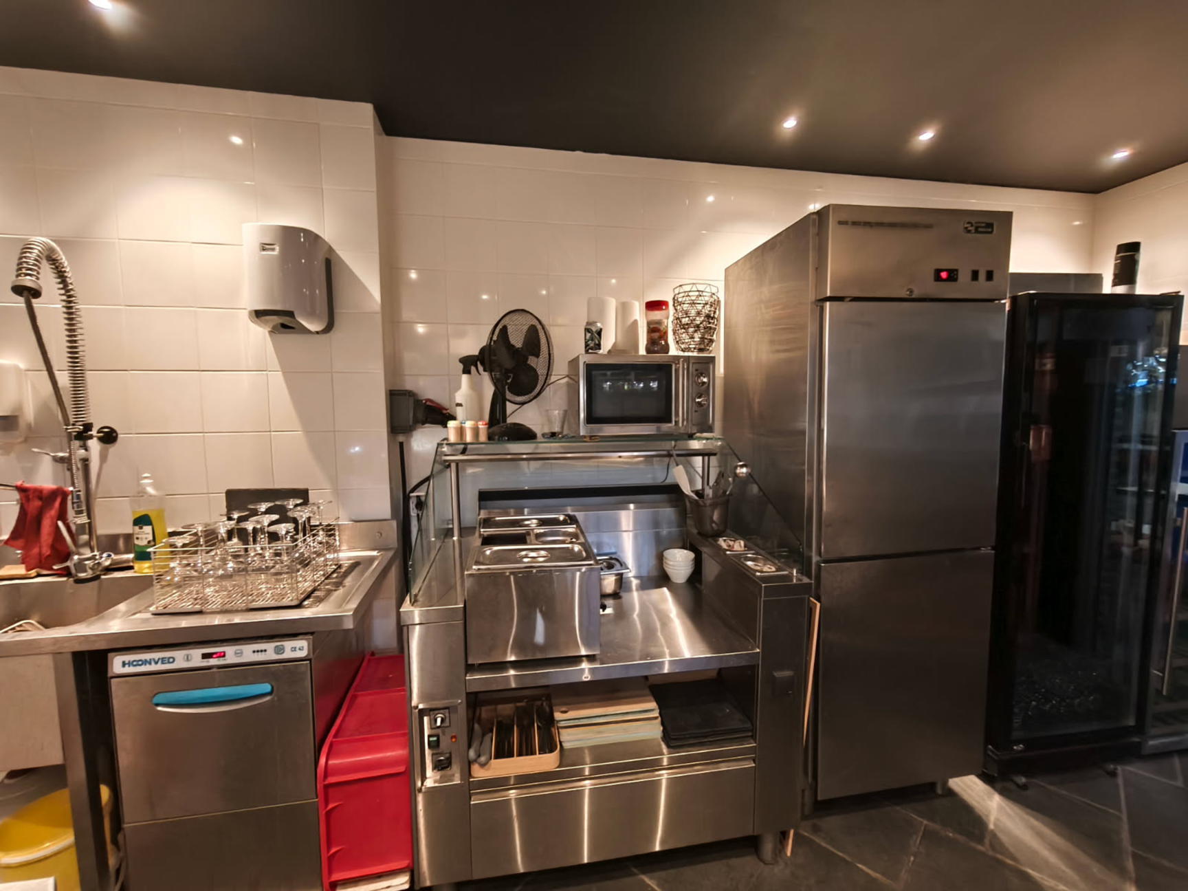 Liste du matériel : vitrine réfrigérée, vitrine frigo, cuiseur pâtes, sous-videuse, show cooking, lave verre, plonge, lave-mains, machine à glaçons, four ventilé, plaque induction, plancha induction, mobilier et agencements divers (valorisé environ 50 000 EUR) Prix : 49 500 EUR honoraires charge vendeur, matériel compris.
