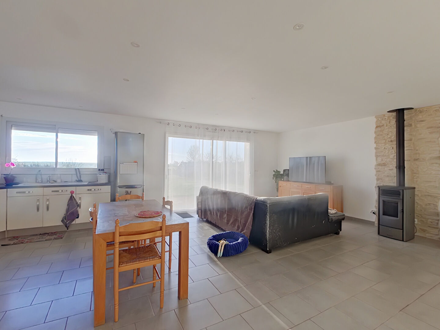 Elle se compose d'une grande pièce de vie avec cuisine aménagée ouverte, de trois chambres, d'une salle d'eau et d'un WC indépendant, une buanderie.
