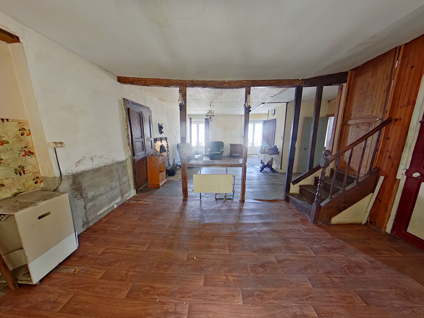 au rdc, coté rue, vaste pièce à vivre de 60m² avec coin cuisine, pièce d'eau avec attente salle d'eau et toilettes.