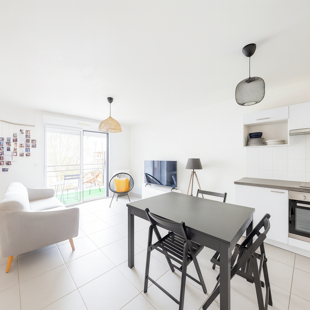 Un séjour lumineux exposé Sud, ouvrant sur une loggia avec vue dégagée sur le jardin de la résidence,