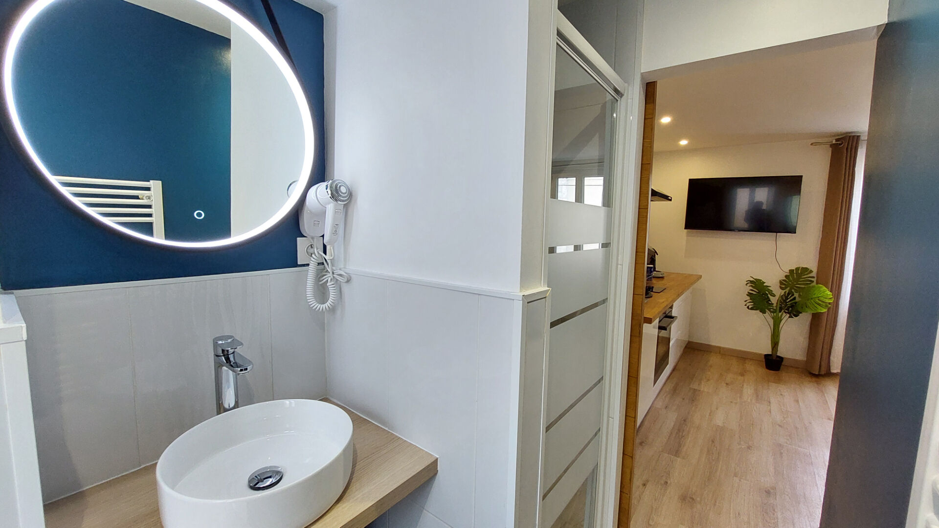 L'ensemble se compose de 3 lots, type studios, configurés et équipés de manière quasi identique. Chaque studio, meublé, comprend une pièce de vie avec cuisine aménagée et équipée ainsi qu'une salle d'eau avec WC (sèche-serviette). Le studio du rez-de-chaussée a son entrée indépendante. Un accès commun dessert les studios du 1er et 2ème étage.