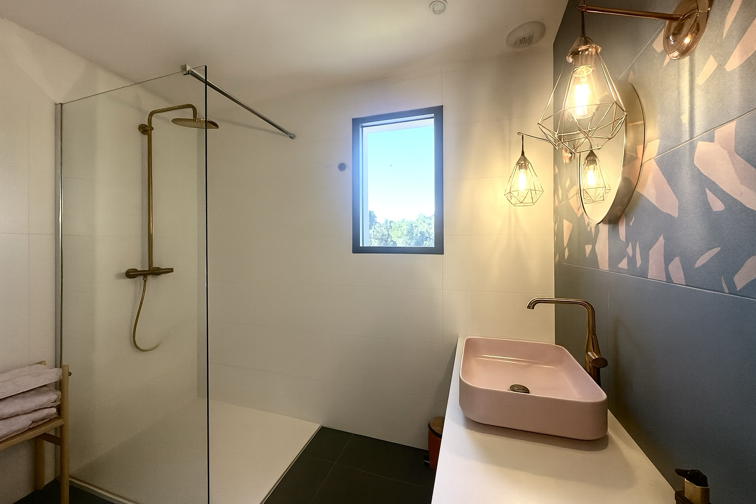 Le rez-de-chaussée accueille une suite parentale avec salle d'eau et dressing. À l'étage, l'espace nuit propose deux chambres, une salle de bain et un WC séparé.