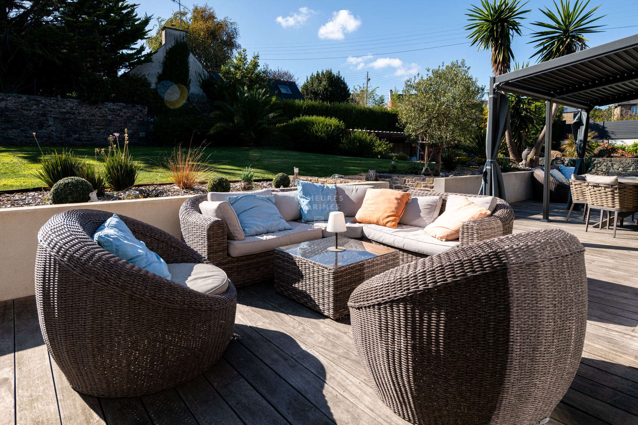 À l'extérieur, un grand jardin de 1957 m2 aménagé en plusieurs espaces distincts vous permettra de profiter de chaque moment : un espace pour les jeux, plusieurs terrasses en bois pour les repas en plein air et une piscine extérieure chauffée avec son pool house pour des après-midis de détente. Le jardin, véritable havre de paix, se prête aussi bien aux moments de repos qu'aux réceptions en extérieur.