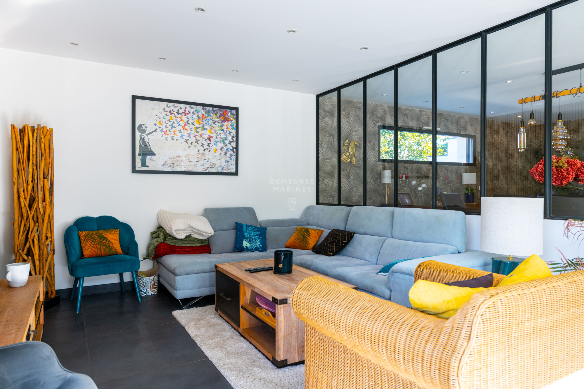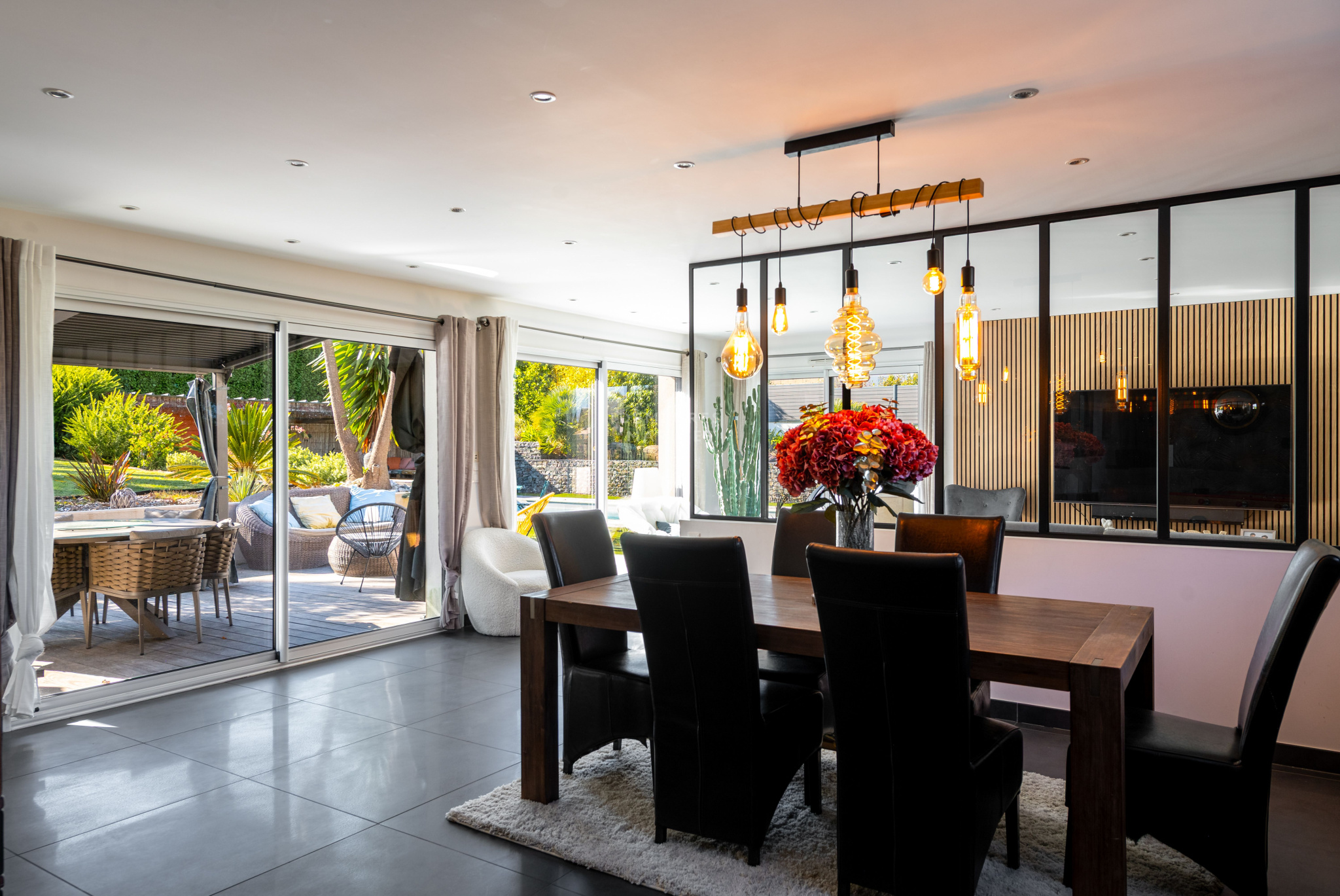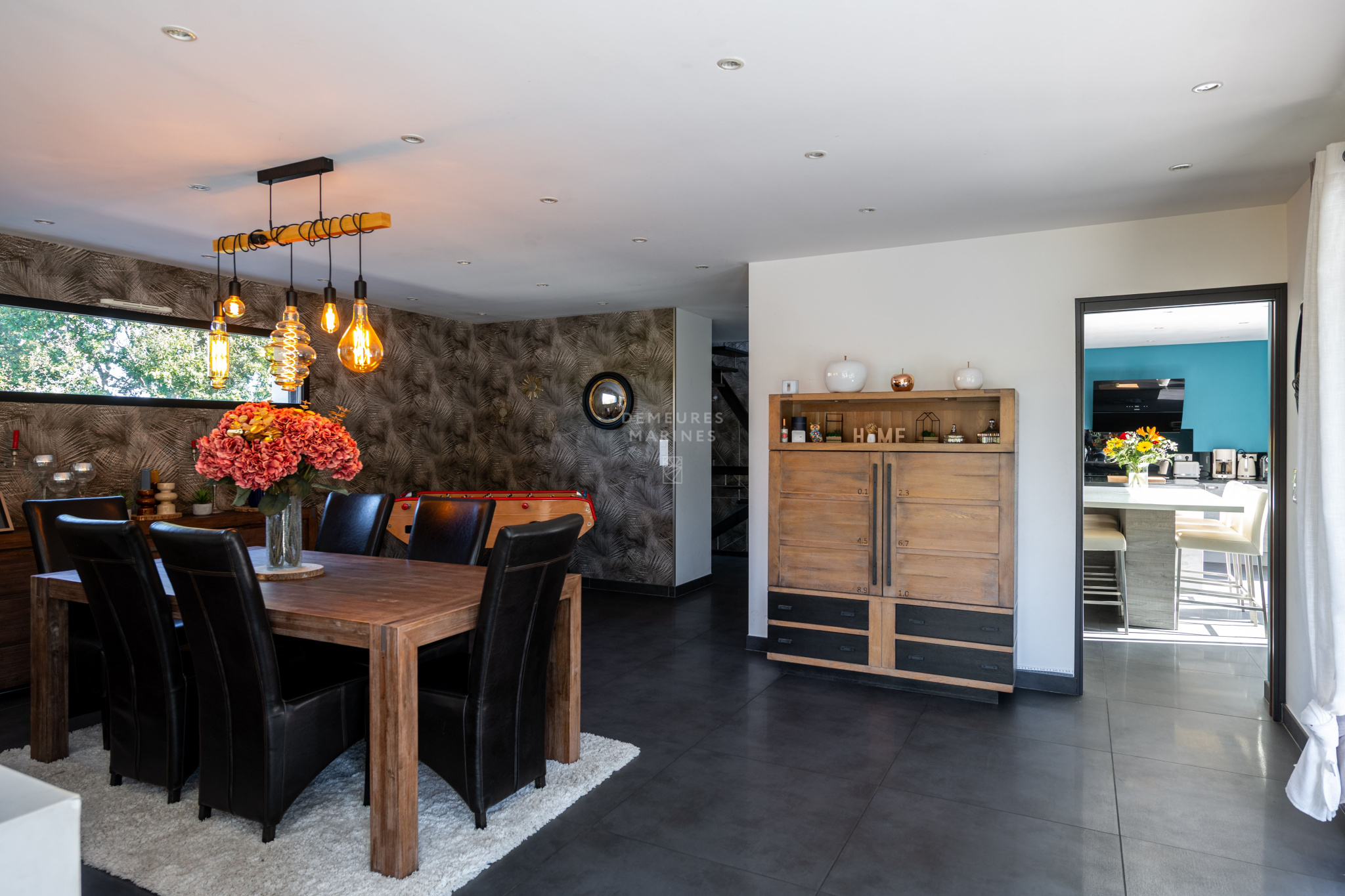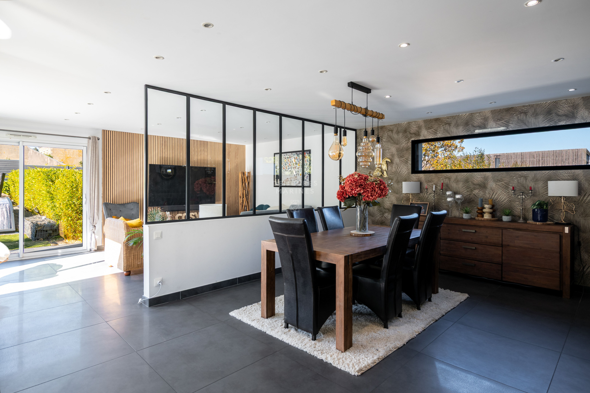 Dès l'entrée, un espace accueillant et lumineux mène vers un salon-séjour spacieux, séparé par une verrière qui apporte une touche de modernité. De larges baies vitrées laissent entrer une belle lumière naturelle et ouvrent la pièce sur l'extérieur. La cuisine, entièrement aménagée et équipée, dispose d'un îlot central parfait pour les repas en petit comité. Une arrière-cuisine vient compléter l'ensemble.