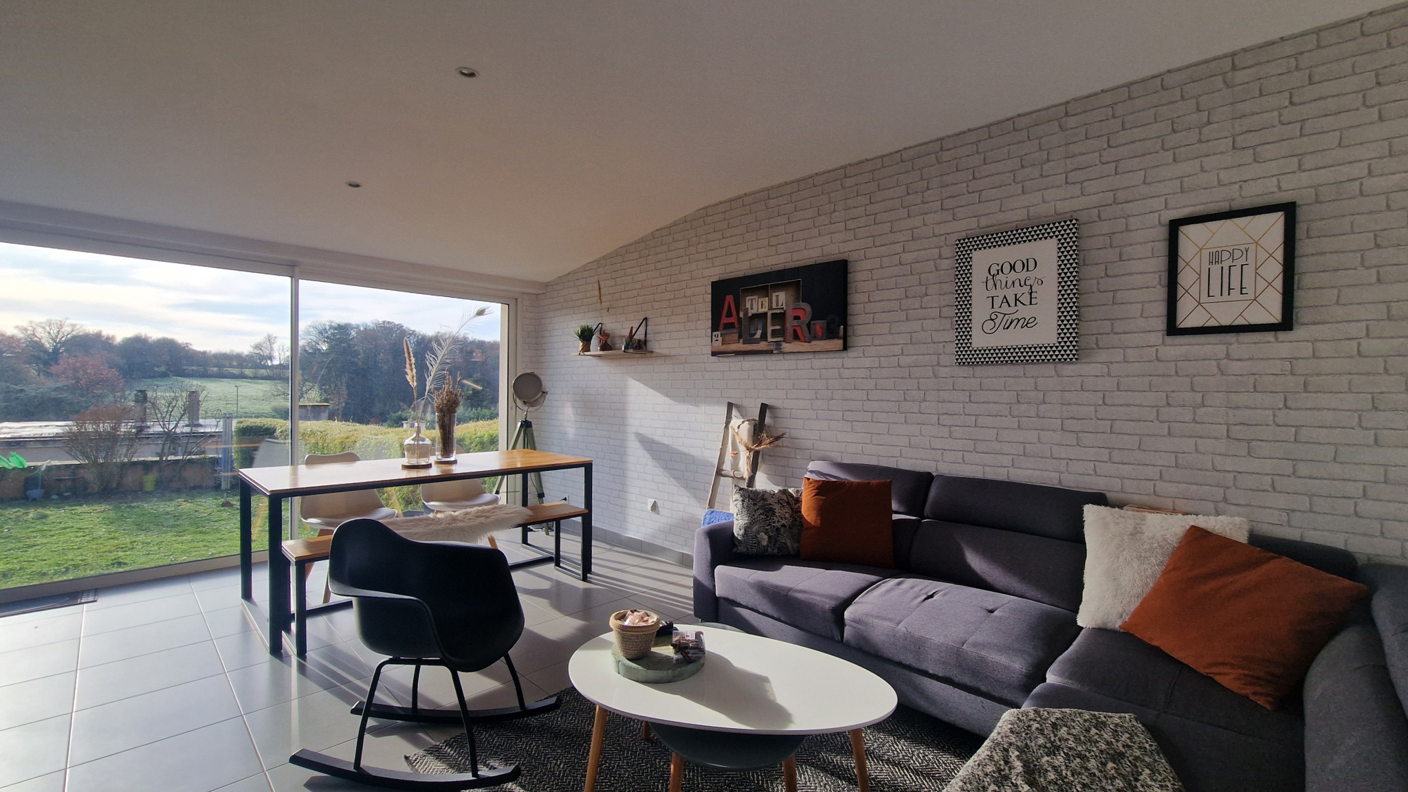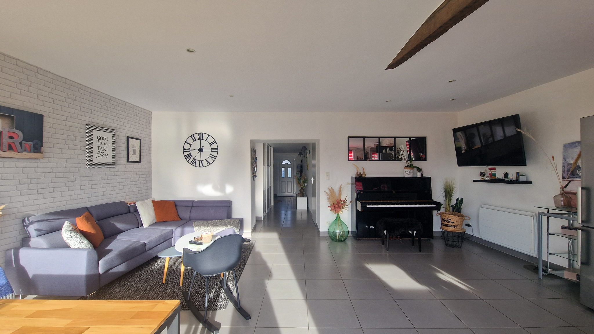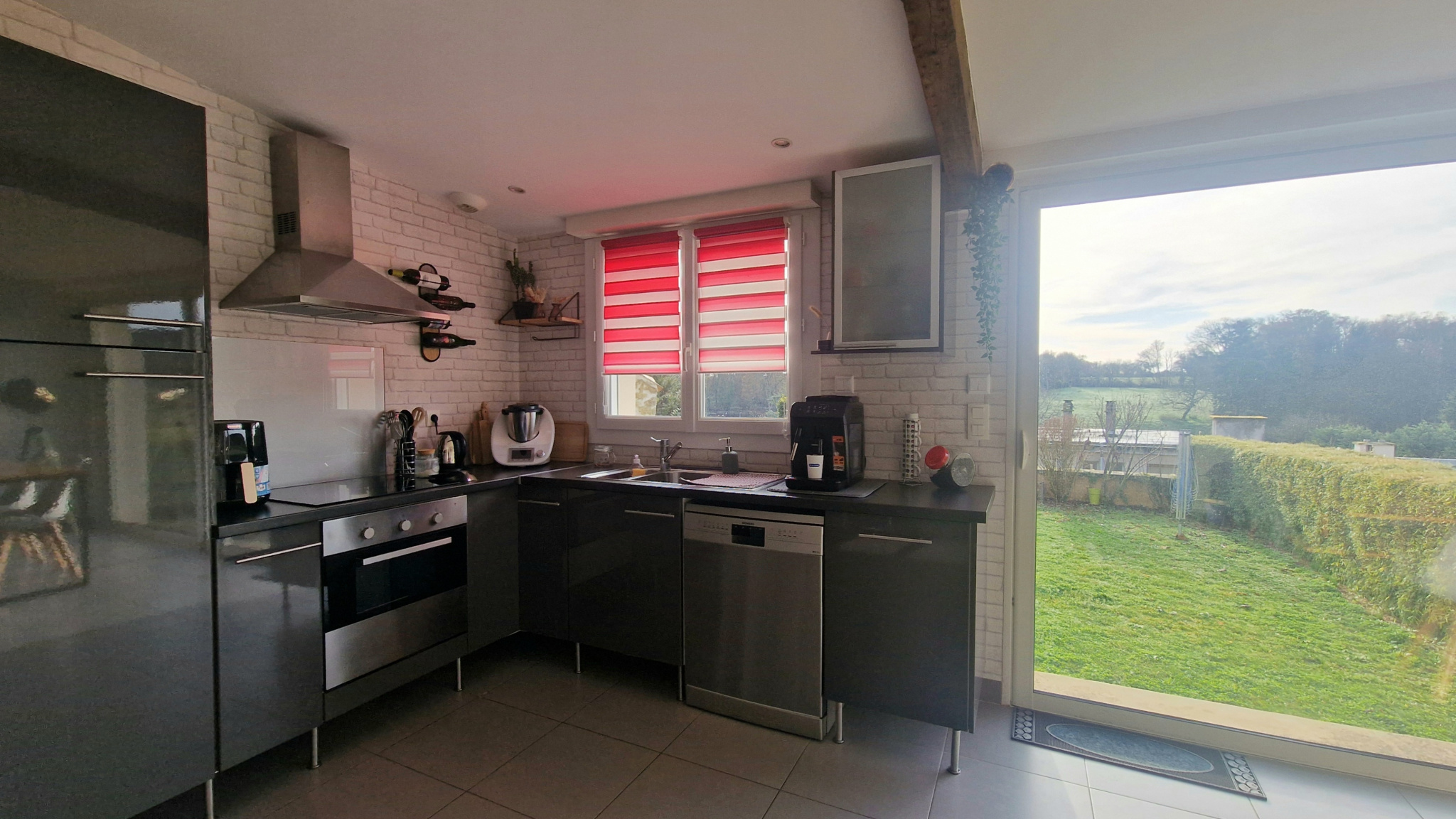 Dès l'entrée, la maison dévoile une agréable pièce de vie lumineuse, avec une cuisine aménagée et équipée ouverte, idéale pour partager des moments conviviaux, ainsi qu'un WC indépendant au rez-de-chaussée.