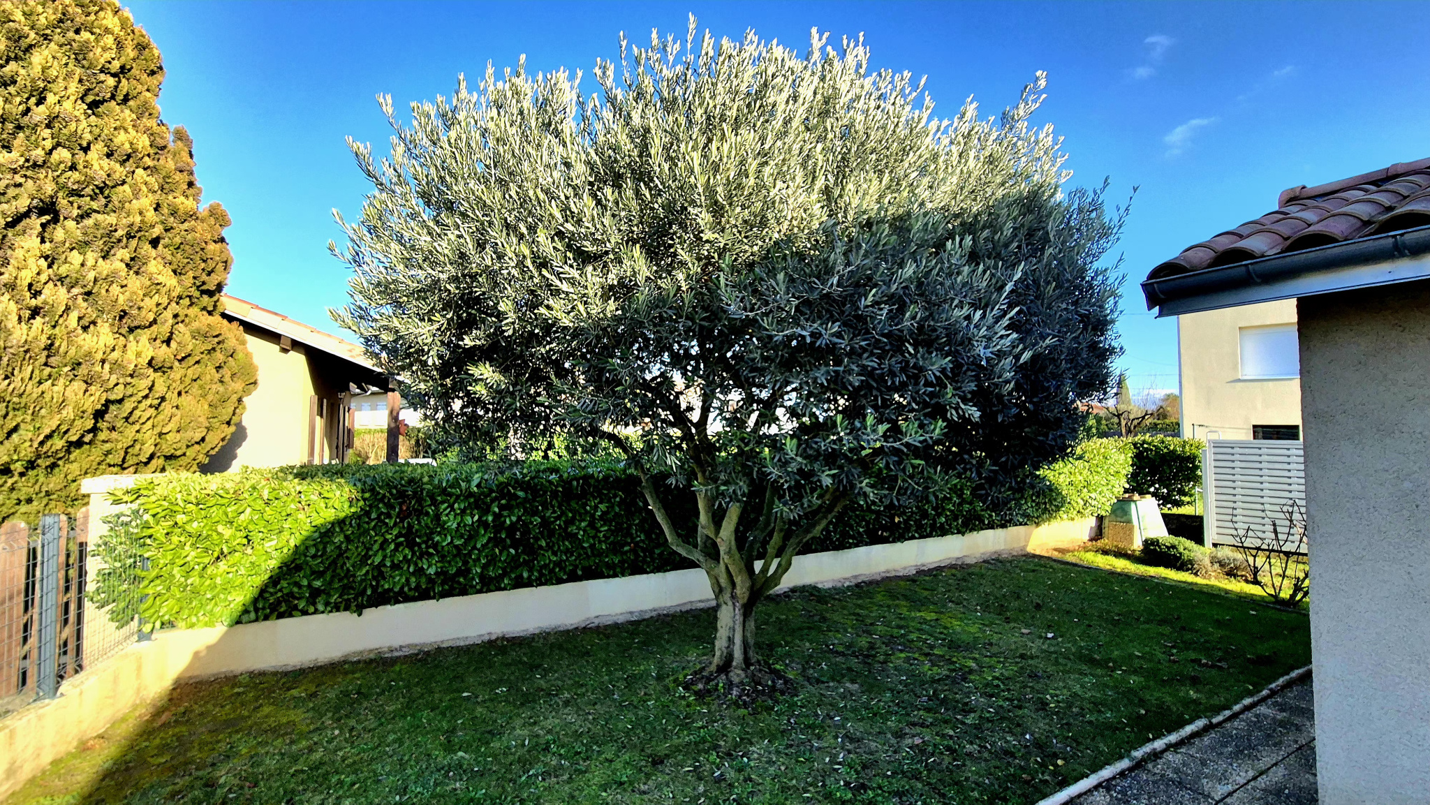 Le terrain de 520 m2 est entièrement clos (adieu les courses-poursuites derrière le chien ou les enfants), arboré, et bordé d'un discret trottoir privé qui fait le tour sans jamais se salir les pieds.