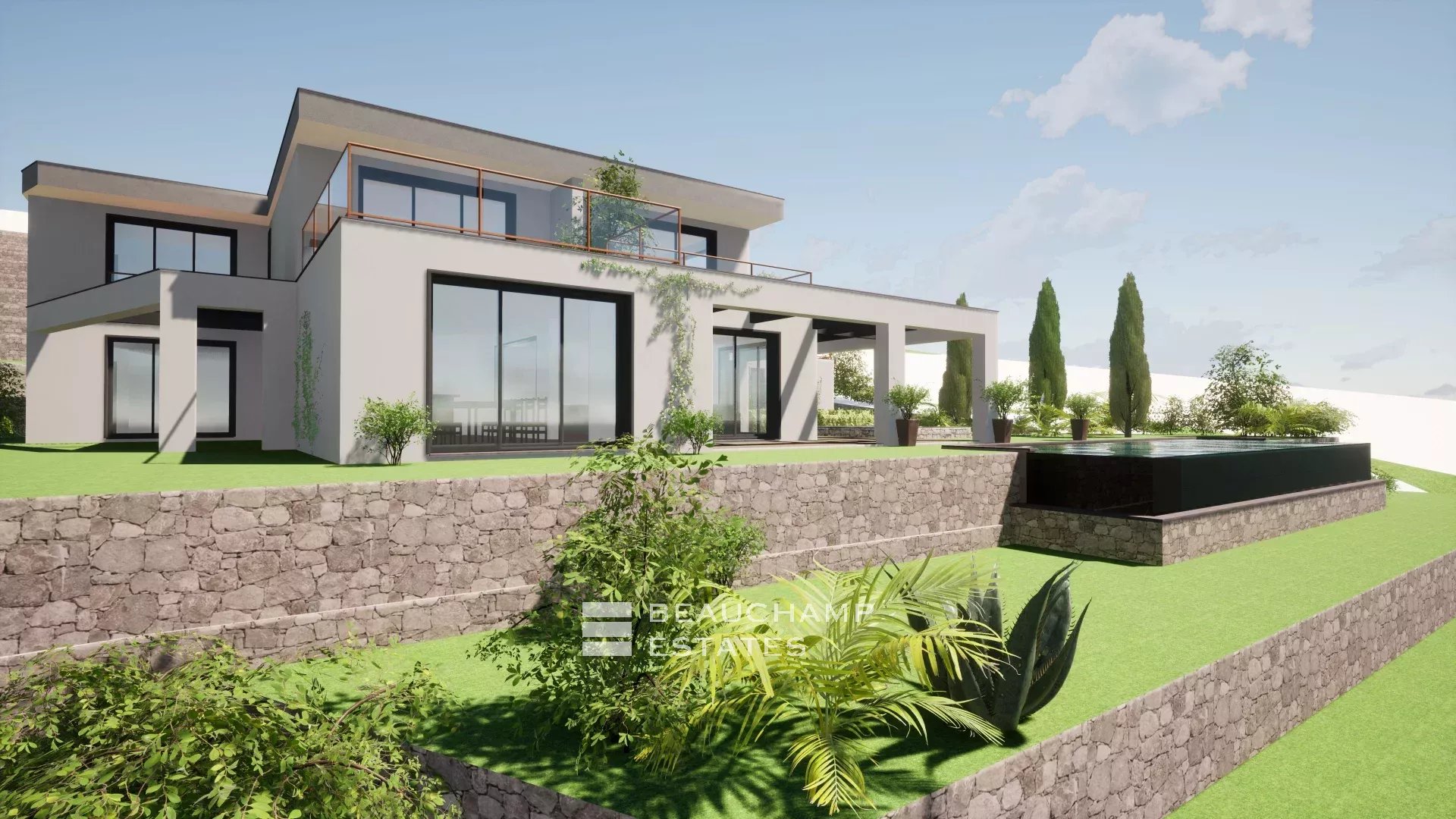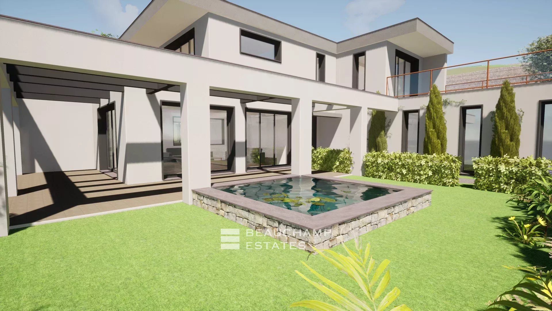 Ce terrain est vendu avec un permis de construire validé (emprise au sol 298,72m2) pour une villa contemporaine qui se compose d'un grand séjour lumineux, de cinq chambres avec salle de bains privative, d'un garage, d'une piscine et de terrasses spacieuses.