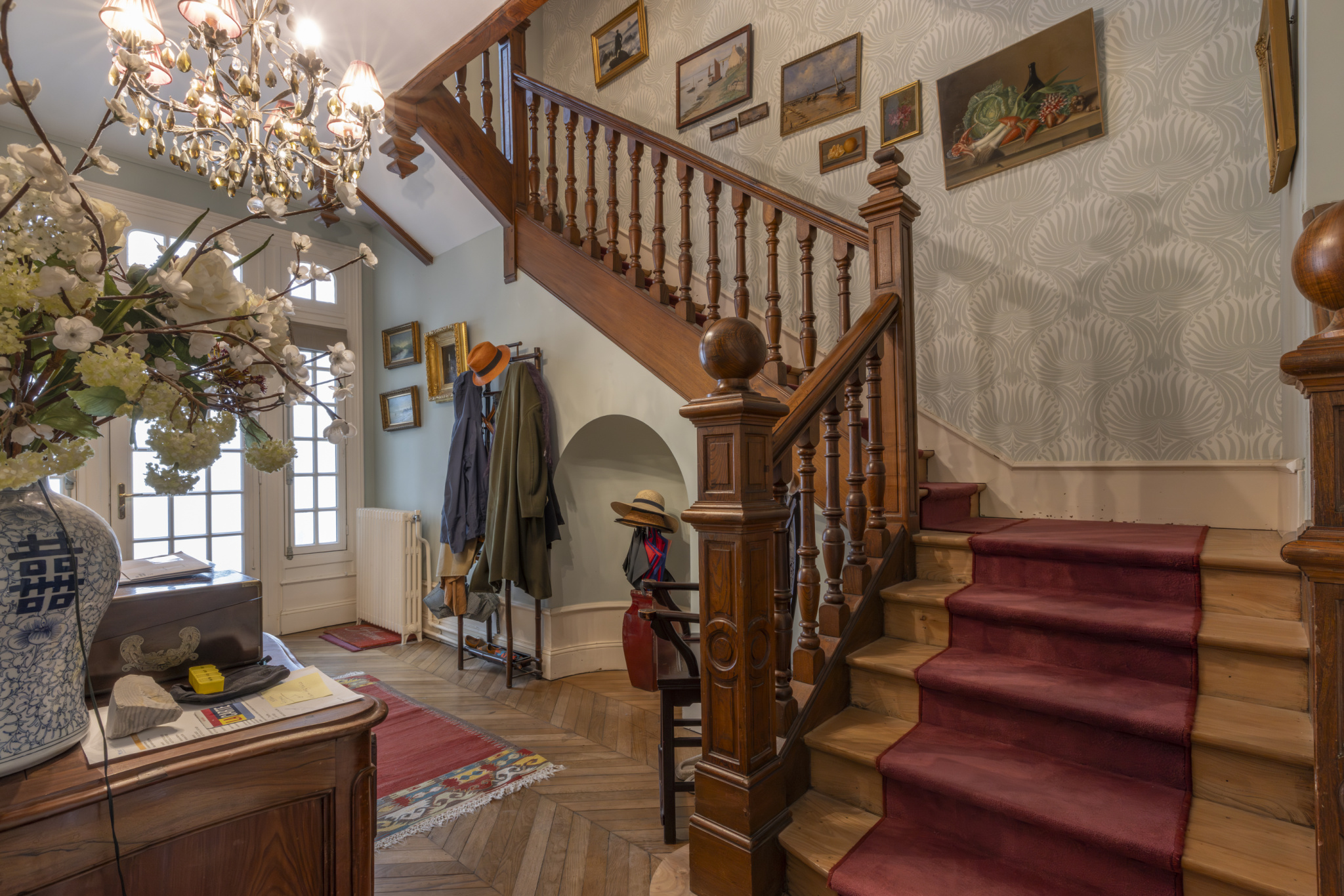 Au premier étage : vaste palier offrant une belle bibliothèque, deux chambres avec chacune son balcon, une salle de bains avec wc, dressing, un wc indépendant.