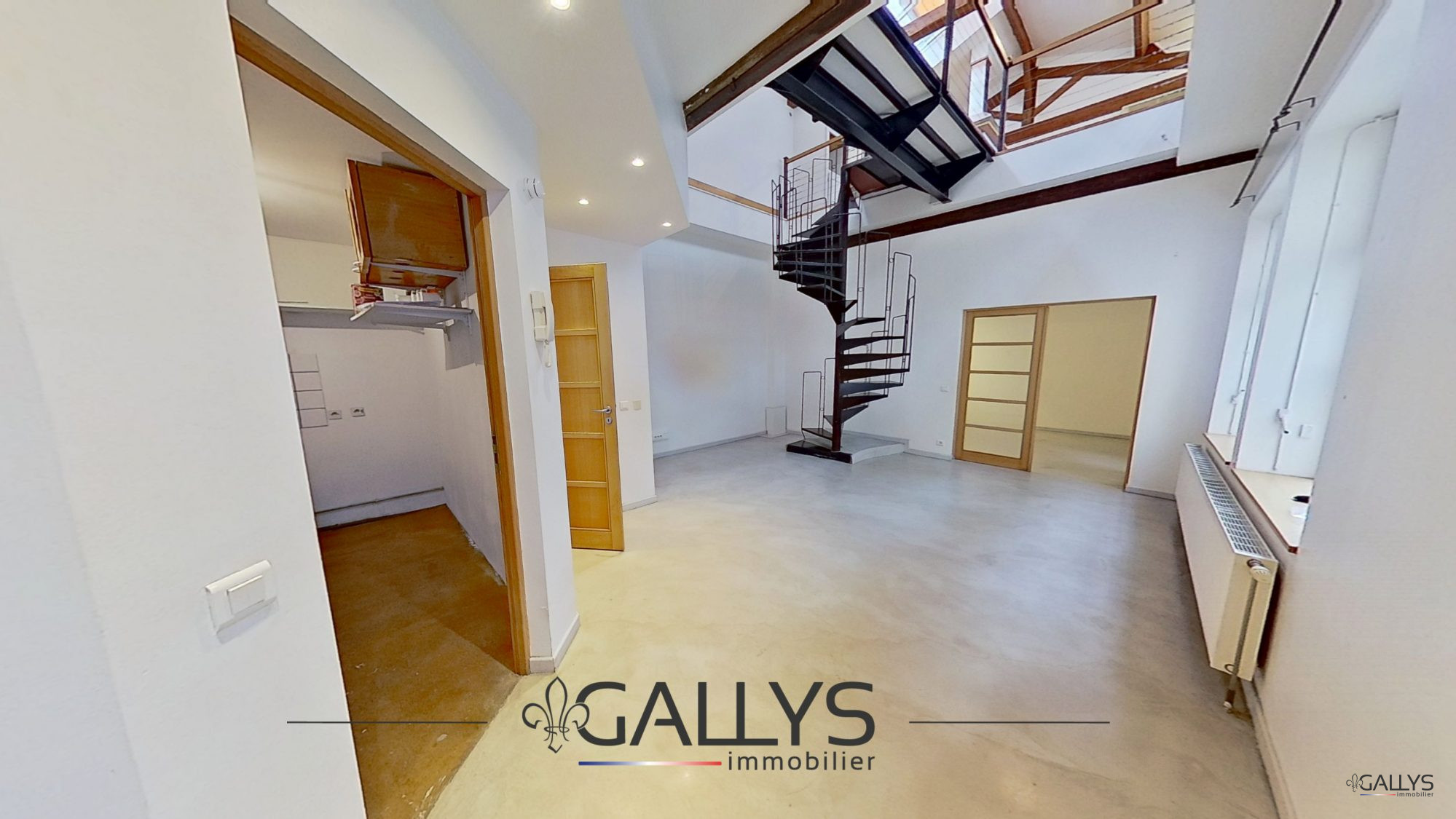 À l'étage, une cuisine semi-équipée s'ouvre sur un séjour accessible par une passerelle, offrant volumes, perspective et caractère. Possibilité de faire une seconde chambre selon les besoins.