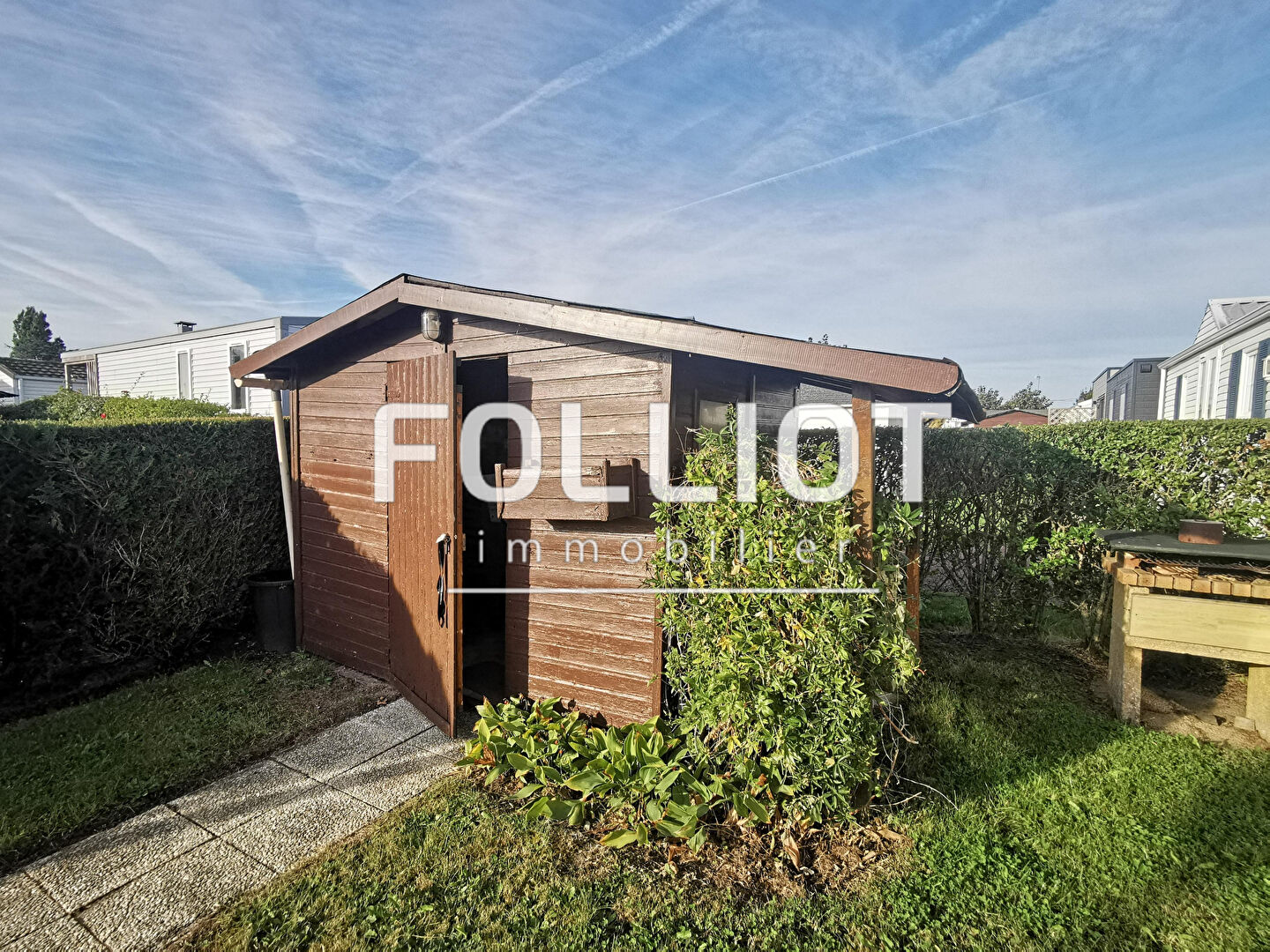 Un cabanon en bois complète le bien, idéal pour le rangement.
