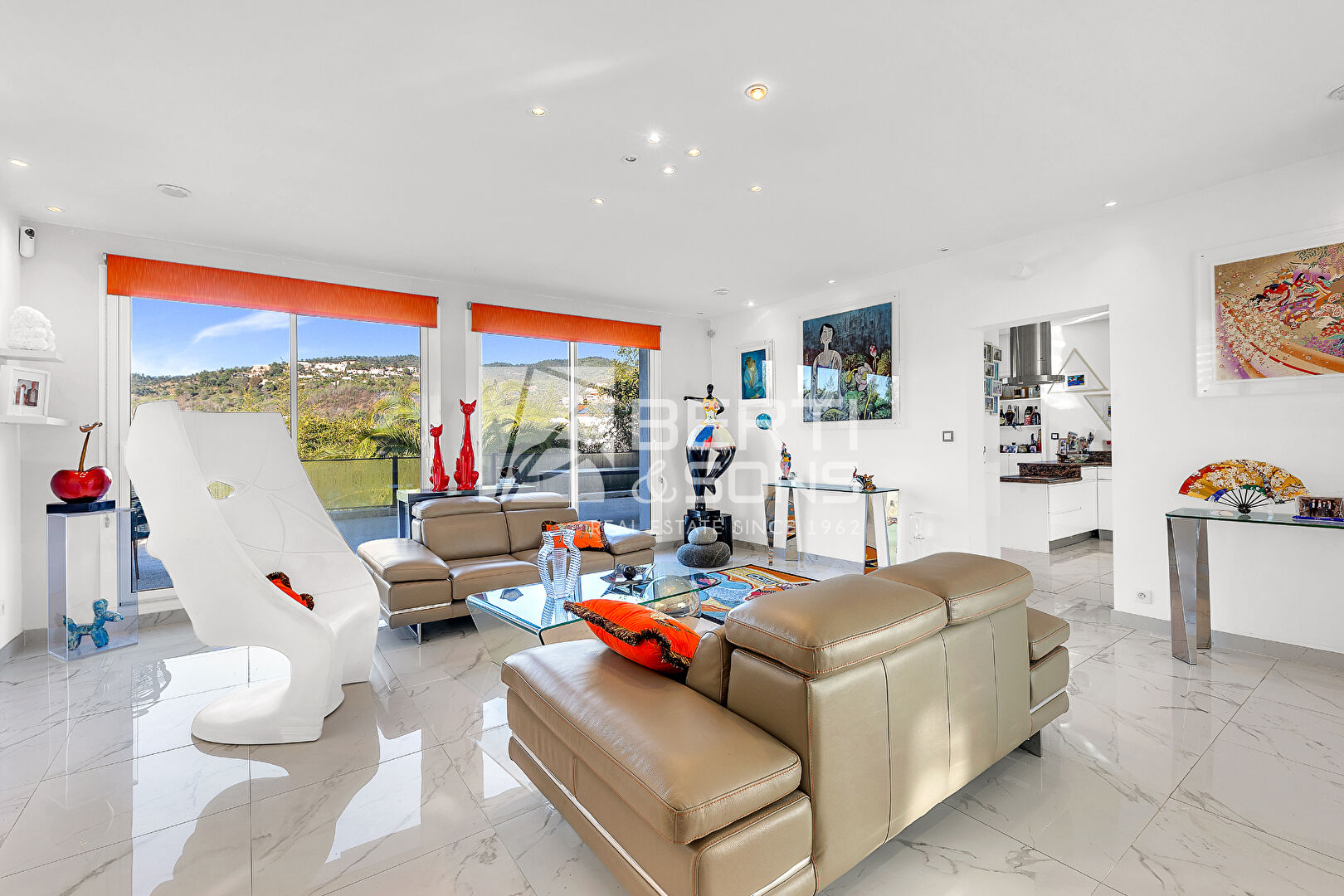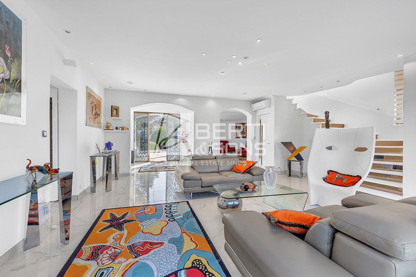 Les espaces de réception, spacieux et élégants, invitent à la convivialité et s'ouvrent naturellement sur les terrasses et le jardin, créant une parfaite continuité entre intérieur et extérieur. Chaque espace a été conçu pour valoriser la lumière, les perspectives et les volumes.