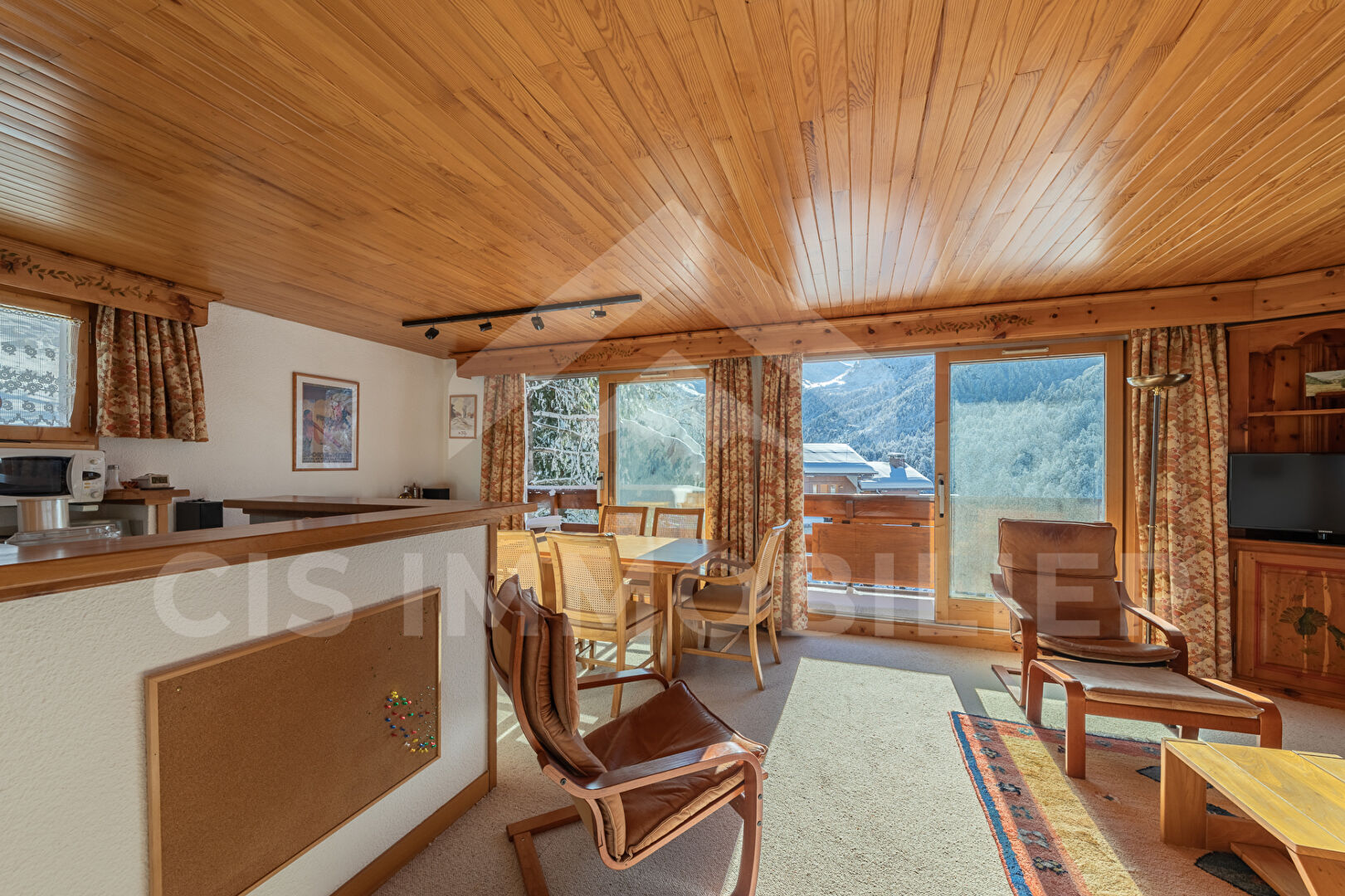 Exclusivité. Vue panoramique et ensoleillement exceptionnel pour cet appartement situé à Méribel- Mottaret. Il est composé d'un vaste séjour double bénéficiant d'une triple exposition et d'un balcon d'angle exposé sud et ouest. Pour compléter, 1 chambre double avec salle de bains, 1 chambre comprenant 4 couchages avec salle de douche et 1 WC indépendant. Cave, casier à skis et garage compris.