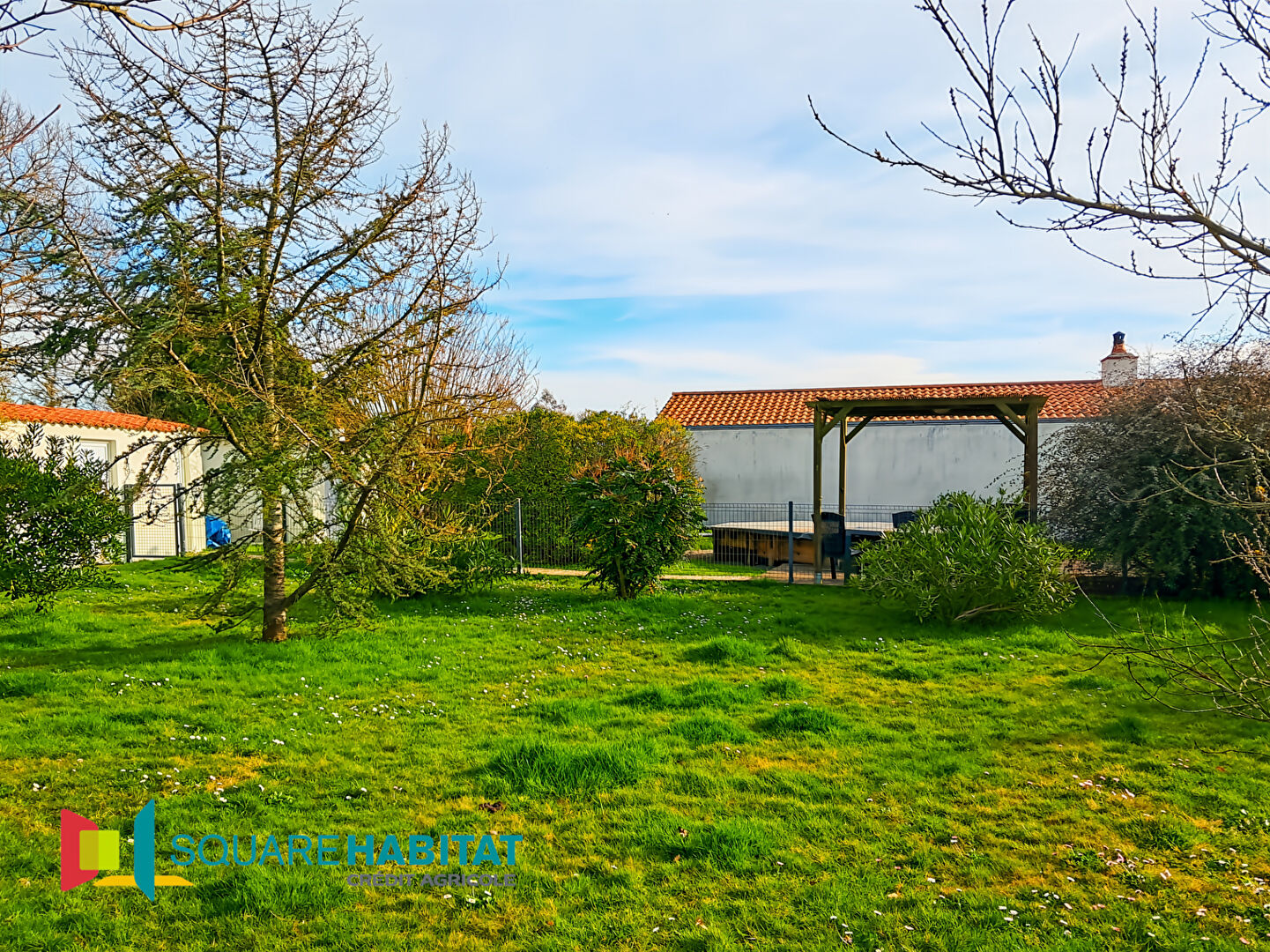 Un jardin paysagé de 1 617 m² sans vis-à-vis avec terrasse, pergola et piscine.