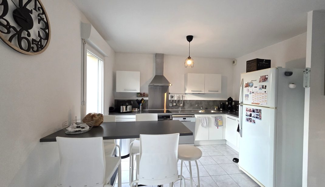 Le RDC offre une entrée, une pièce de vie traversante avec double exposition (est/ouest) de 31.54m2, une cuisine ouverte, équipée et aménagée de 8.60m2.