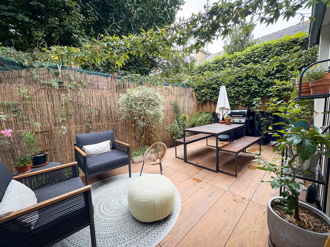 À l'extérieur, un petit coin de verdure sans vis-à-vis invite à la détente, à l'abri de l'effervescence urbaine, tout en conservant un accès immédiat aux commerces, transports et écoles.