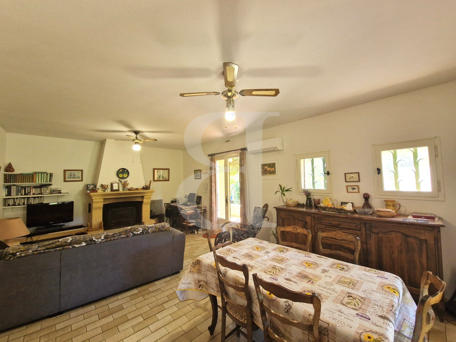 Séjour avec cheminée et accès terrasse 30 m²