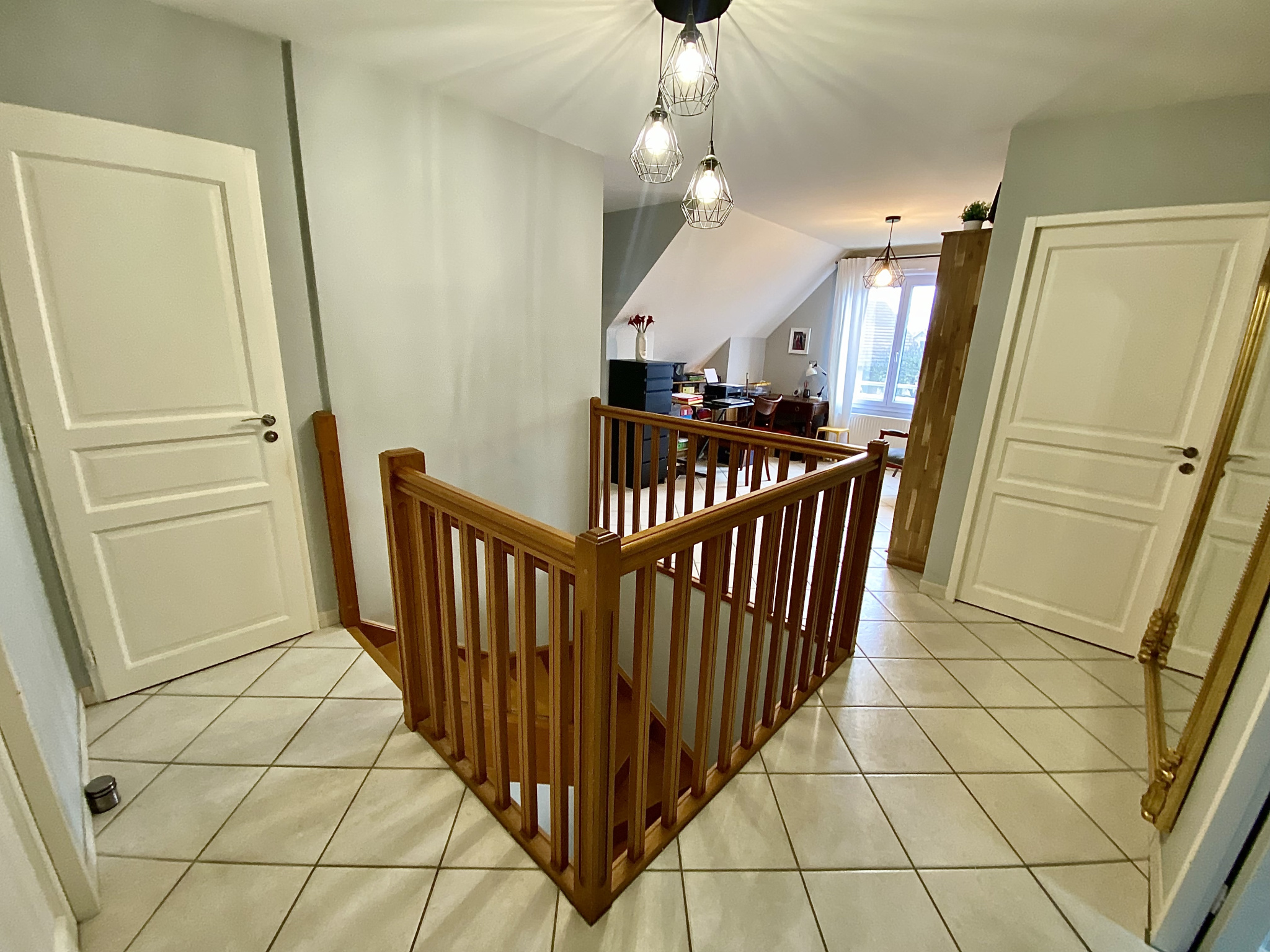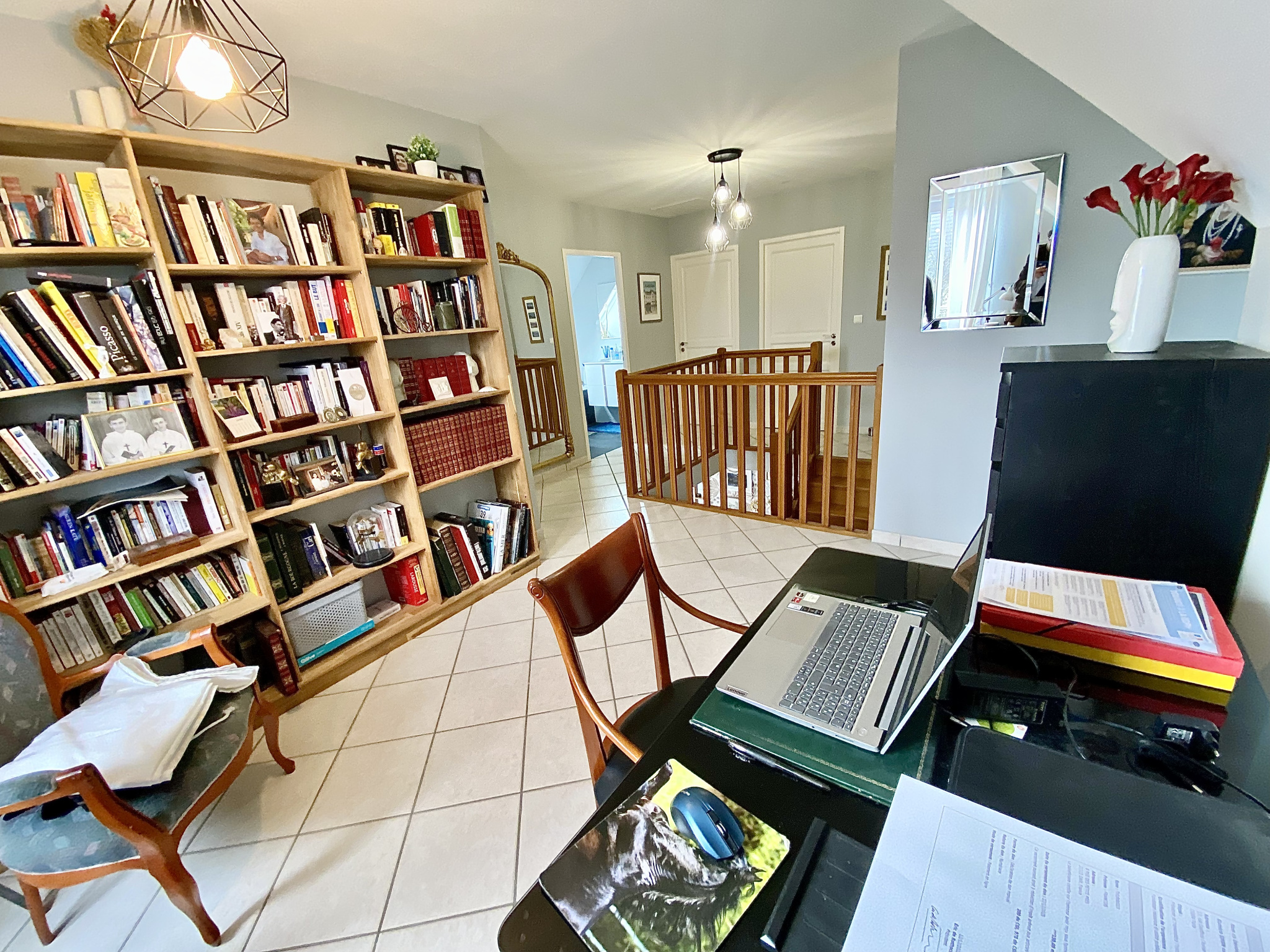 A l'étage se trouve un grand pallier / bureau desservant quatre chambres dont une suite parentale avec salle d'eau attenante, une salle de bains avec meuble vasque, douche et baignoire, WC séparés.